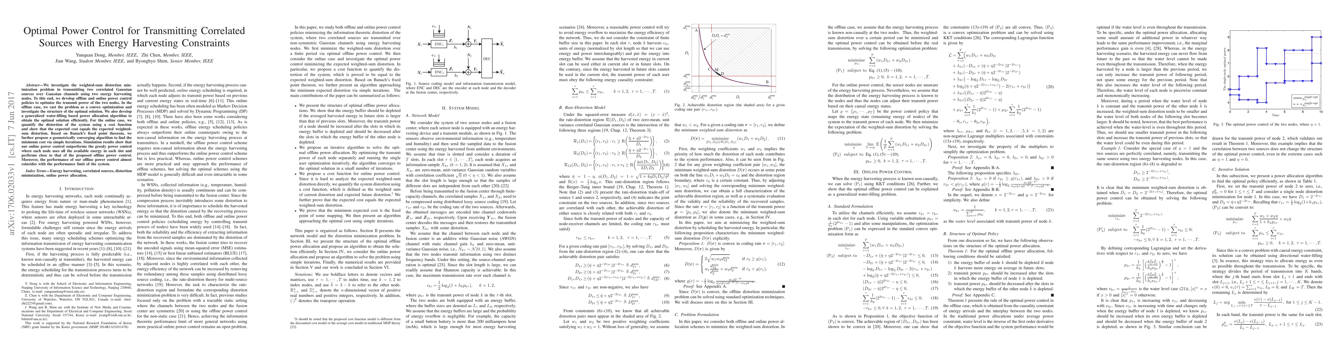 This paper develops optimal power control strategies for transmitting correlated Gaussian sources over Gaussian channels using two energy-harvesting nodes. It presents both offline convex optimization and online geometrically converging algorithms to minimize the weighted-sum distortion, demonstrating superior performance compared to greedy power control methods.