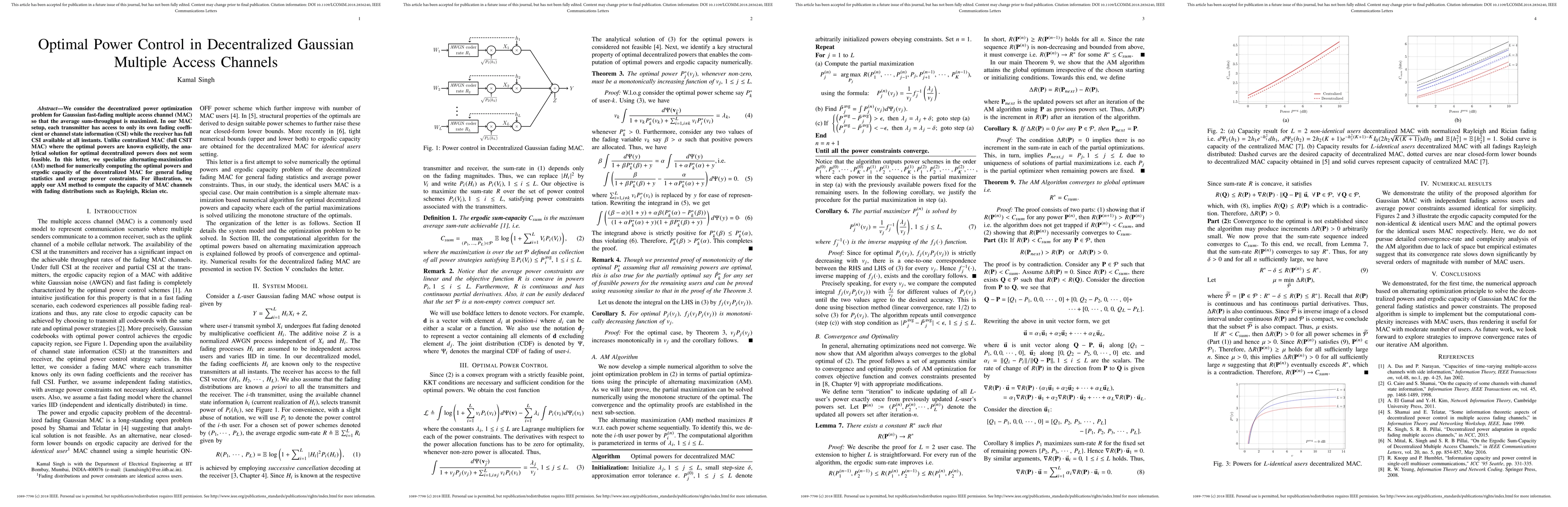 This paper addresses the decentralized power optimization problem in Gaussian multiple access channels (MAC) to maximize average sum-throughput. It employs an alternating-maximization method to numerically determine optimal power settings and ergodic capacity under decentralized channel state information, demonstrating its application to various fading distributions.