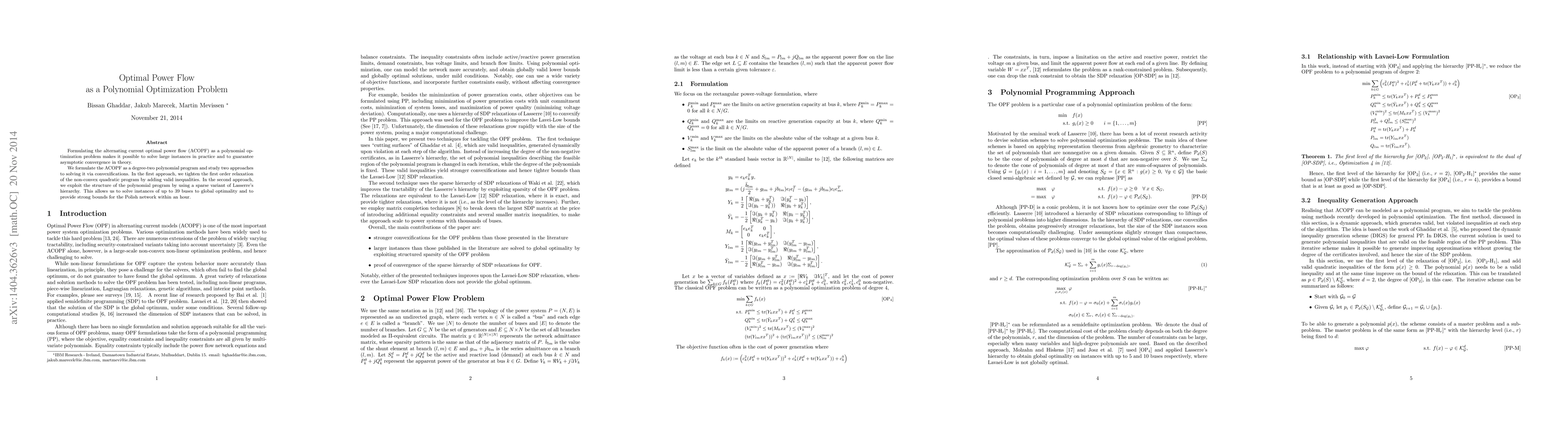Summary: This paper formulates the alternating current optimal power flow (ACOPF) as a polynomial optimization problem, enabling practical solutions for large instances and theoretical guarantees of asymptotic convergence.