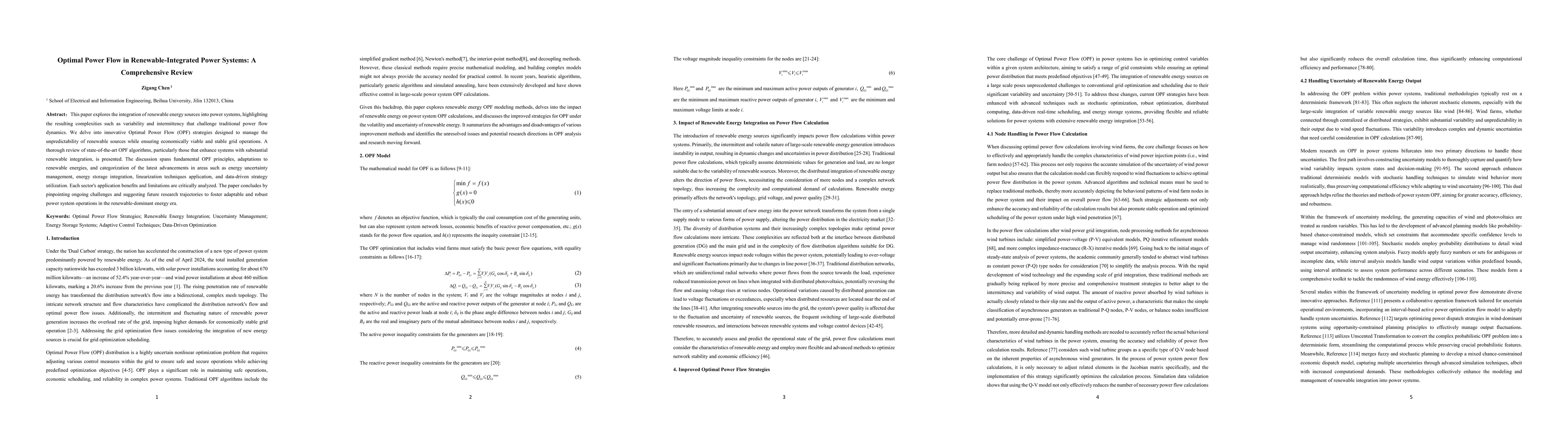 This paper explores the integration of renewable energy sources into power systems, highlighting the resulting complexities such as variability and intermittency that challenge traditional power flow dynamics. We delve into innovative Optimal Power Flow (OPF) strategies designed to manage the unpredictability of renewable sources while ensuring economically viable and stable grid operations. A thorough review of state-of-the-art OPF algorithms, particularly those that enhance systems with substantial renewable integration, is presented. The discussion spans fundamental OPF principles, adaptations to renewable energies, and categorization of the latest advancements in areas such as energy uncertainty management, energy storage integration, linearization techniques application, and data-driven strategy utilization. Each sector's application benefits and limitations are critically analyzed. The paper concludes by pinpointing ongoing challenges and suggesting future research trajectories to foster adaptable and robust power system operations in the renewable-dominant energy era.