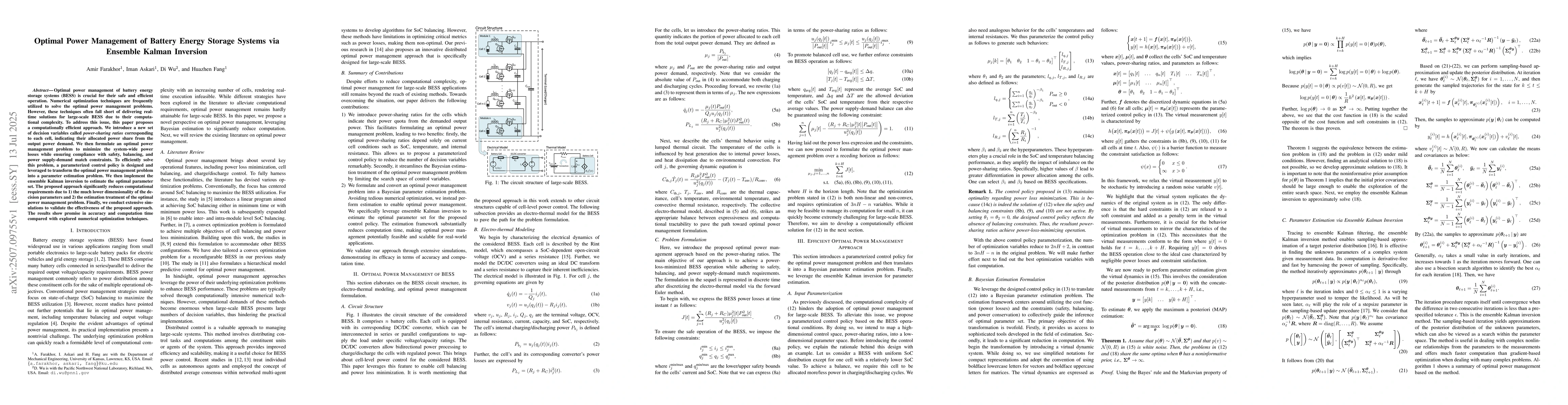Optimal power management of battery energy storage systems (BESS) is crucial for their safe and efficient operation. Numerical optimization techniques are frequently utilized to solve the optimal power management problems. However, these techniques often fall short of delivering real-time solutions for large-scale BESS due to their computational complexity. To address this issue, this paper proposes a computationally efficient approach. We introduce a new set of decision variables called power-sharing ratios corresponding to each cell, indicating their allocated power share from the output power demand. We then formulate an optimal power management problem to minimize the system-wide power losses while ensuring compliance with safety, balancing, and power supply-demand match constraints. To efficiently solve this problem, a parameterized control policy is designed and leveraged to transform the optimal power management problem into a parameter estimation problem. We then implement the ensemble Kalman inversion to estimate the optimal parameter set. The proposed approach significantly reduces computational requirements due to 1) the much lower dimensionality of the decision parameters and 2) the estimation treatment of the optimal power management problem. Finally, we conduct extensive simulations to validate the effectiveness of the proposed approach. The results show promise in accuracy and computation time compared with explored numerical optimization techniques.