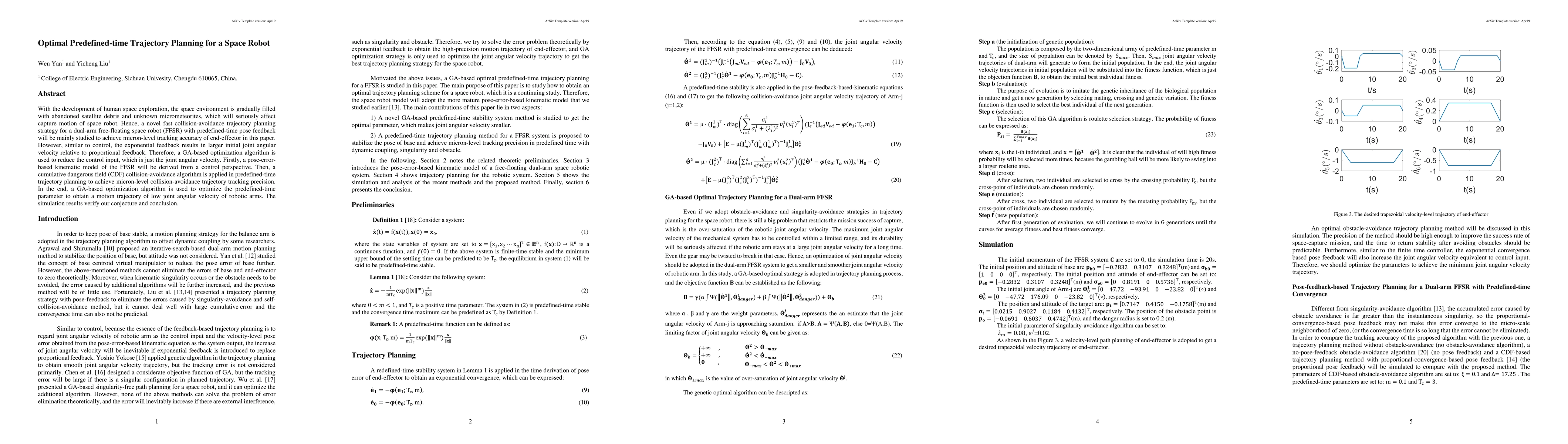 This paper proposes a novel predefined-time trajectory planning strategy for a dual-arm free-floating space robot to achieve micron-level tracking accuracy while avoiding collisions with debris. A cumulative dangerous field algorithm is used to plan collision-free trajectories, and a genetic algorithm optimizes predefined-time parameters to minimize joint angular velocity.