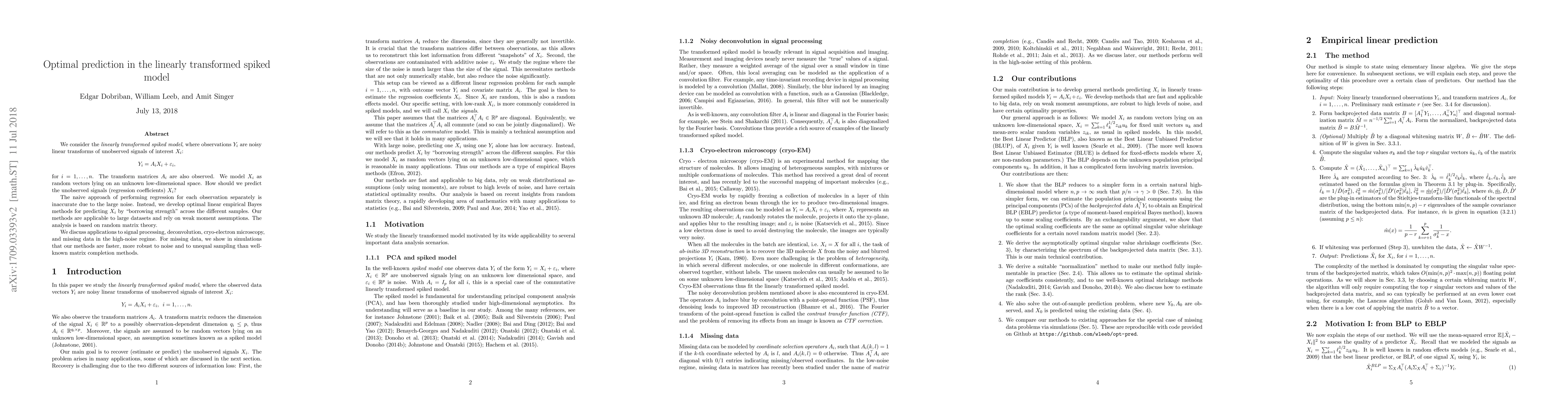 We consider the linearly transformed spiked model, where observations $Y_i$ are noisy linear transforms of unobserved signals of interest $X_i$: \begin{align*} Y_i = A_i X_i + \varepsilon_i, \end{align*} for $i=1,\ldots,n$. The transform matrices $A_i$ are also observed. We model $X_i$ as random vectors lying on an unknown low-dimensional space. How should we predict the unobserved signals (regression coefficients) $X_i$? The naive approach of performing regression for each observation separately is inaccurate due to the large noise. Instead, we develop optimal linear empirical Bayes methods for predicting $X_i$ by "borrowing strength" across the different samples. Our methods are applicable to large datasets and rely on weak moment assumptions. The analysis is based on random matrix theory. We discuss applications to signal processing, deconvolution, cryo-electron microscopy, and missing data in the high-noise regime. For missing data, we show in simulations that our methods are faster, more robust to noise and to unequal sampling than well-known matrix completion methods.