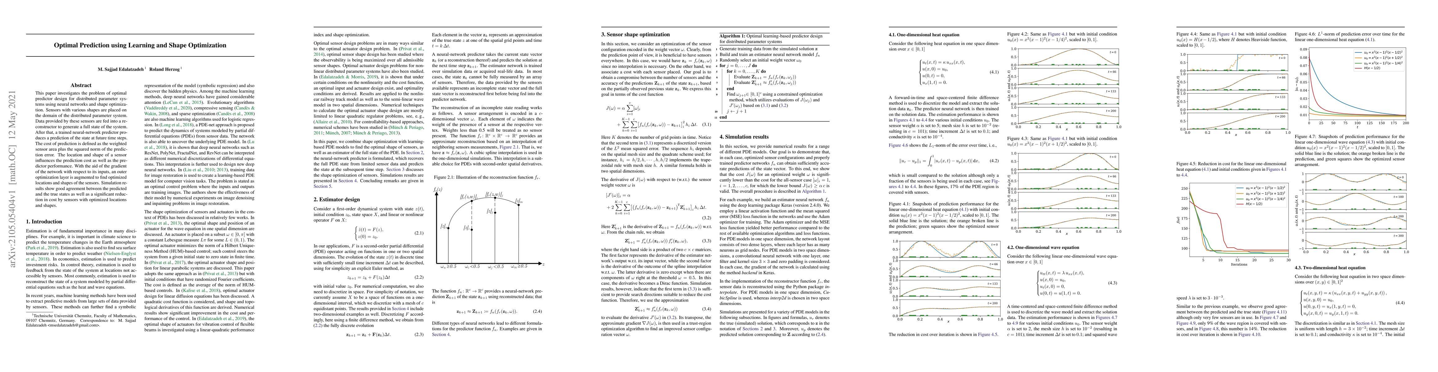 This paper investigates the problem of optimal predictor design for distributed parameter systems using neural networks and shape optimization. Sensors with various shapes are placed on the domain of the distributed parameter system. Data provided by these sensors are fed into a re-constructor to generate a full state of the system. After that, a trained neural-network predictor produces a prediction of the state at future time steps. The cost of prediction is defined as the weighted sensor area plus the squared norm of the prediction error. The location and shape of a sensor influences the prediction cost as well as the predictor performance. With the aid of the gradient of the network with respect to its inputs, an outer optimization layer is augmented to find optimized locations and shapes of the sensors. Simulation results show good agreement between the predicted and the true states as well as a significant reduction in cost by sensors with optimized locations and shapes.