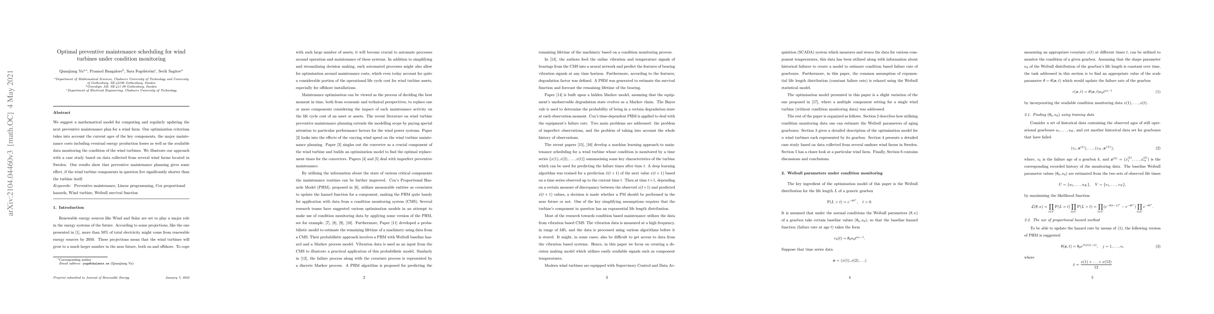 This paper proposes a mathematical model for optimizing preventive maintenance schedules for wind turbines, factoring in component ages, maintenance costs, and condition monitoring data. The model's effectiveness is demonstrated through a case study in Swedish wind farms, showing benefits when component lifespans are significantly shorter than the turbine's lifespan.