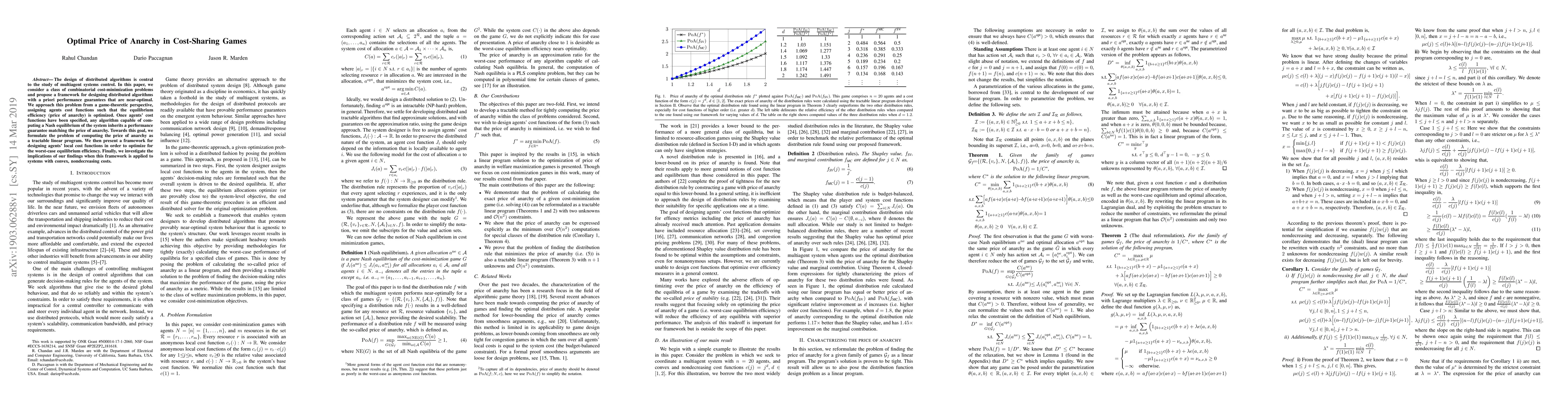 This paper proposes a framework for designing distributed algorithms in multiagent systems with near-optimal performance guarantees, using game theory to optimize equilibrium efficiency (price of anarchy). The method involves formulating the problem as a linear program and designing agents' cost functions for worst-case equilibrium efficiency, with implications for systems with convex, nondecreasing costs.