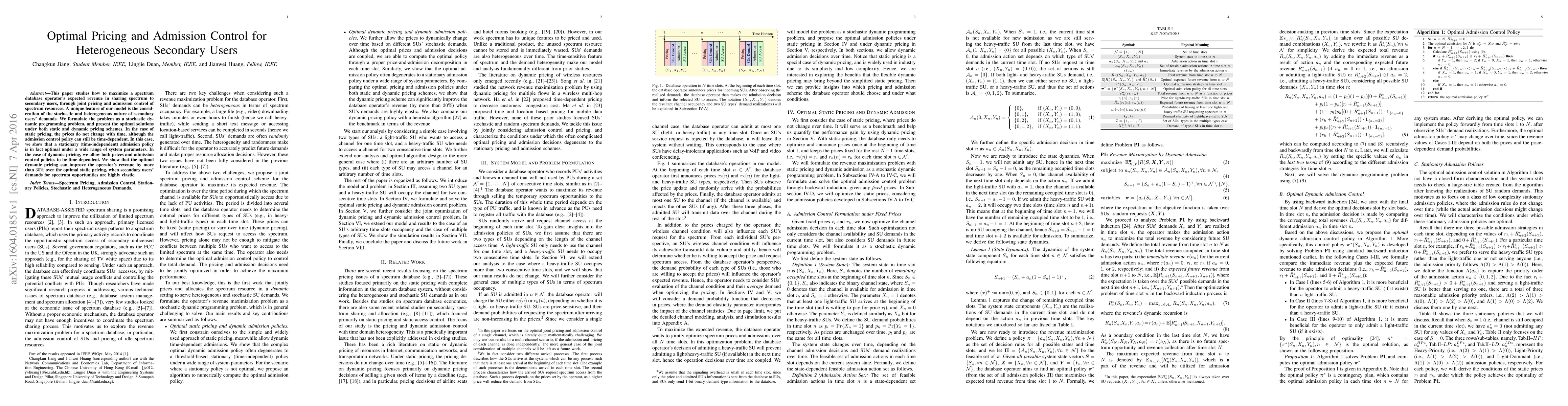 This paper optimizes the revenue of a spectrum database operator by jointly determining pricing and admission control for heterogeneous secondary users. It demonstrates that dynamic pricing, allowing both prices and admission policies to vary over time, can significantly boost revenue compared to static pricing, especially when user demand is highly elastic.