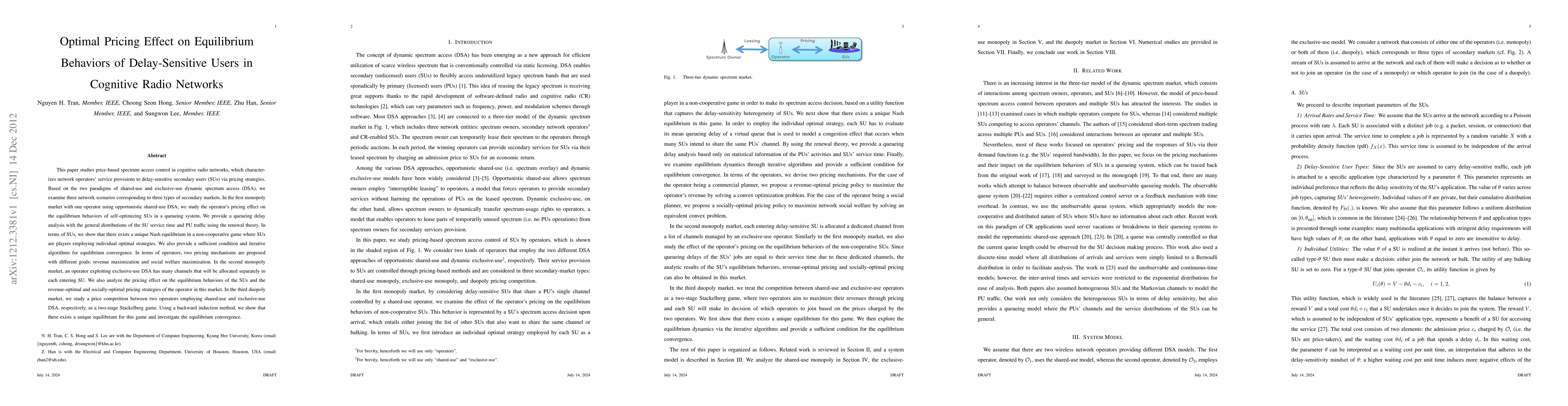 This paper examines pricing strategies in cognitive radio networks to influence the equilibrium behaviors of delay-sensitive secondary users under shared-use and exclusive-use dynamic spectrum access. It analyzes three market scenarios, proposing pricing mechanisms for revenue and social welfare maximization, and provides algorithms for equilibrium convergence.