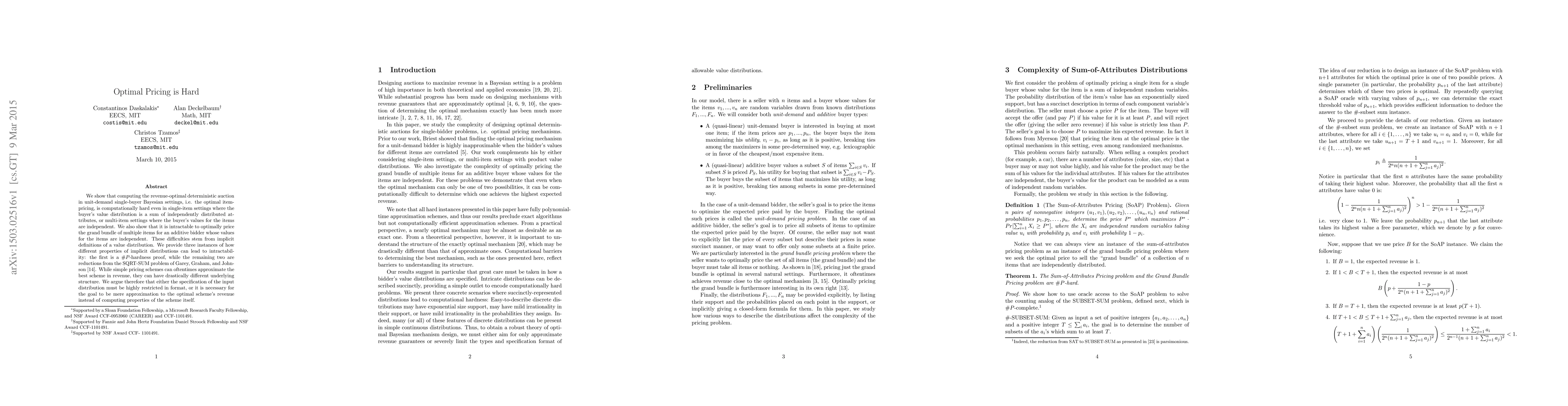 Computing optimal pricing in auctions is hard due to implicit definitions of value distributions, making it #P-hard and intractable for some settings. Simple pricing schemes may approximate the best scheme but have different underlying structures.