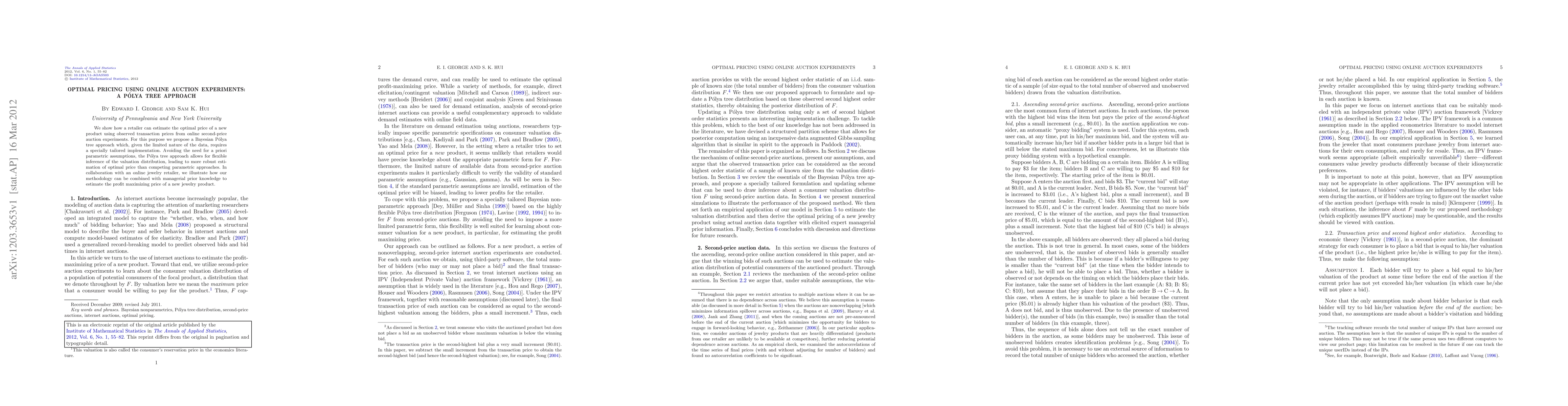 This paper proposes a Bayesian Pólya tree approach to estimate the optimal price for a new product using data from online auction experiments. Unlike parametric methods, this flexible approach allows for robust inference without prior assumptions, demonstrated through a case study with an online jewelry retailer.