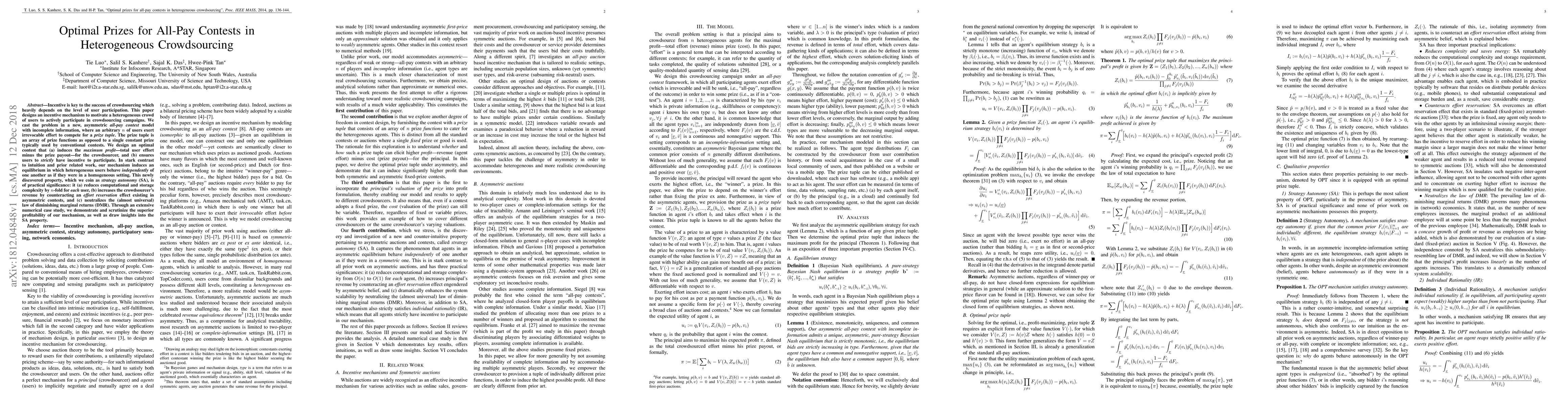 Incentives are key to the success of crowdsourcing which heavily depends on the level of user participation. This paper designs an incentive mechanism to motivate a heterogeneous crowd of users to actively participate in crowdsourcing campaigns. We cast the problem in a new, asymmetric all-pay contest model with incomplete information, where an arbitrary n of users exert irrevocable effort to compete for a prize tuple. The prize tuple is an array of prize functions as opposed to a single constant prize typically used by conventional contests. We design an optimal contest that (a) induces the maximum profit---total user effort minus the prize payout---for the crowdsourcer, and (b) ensures users to strictly have the incentive to participate. In stark contrast to intuition and prior related work, our mechanism induces an equilibrium in which heterogeneous users behave independently of one another as if they were in a homogeneous setting. This newly discovered property, which we coin as strategy autonomy (SA), is of practical significance: it (a) reduces computational and storage complexity by n-fold for each user, (b) increases the crowdsourcer's revenue by counteracting an effort reservation effect existing in asymmetric contests, and (c) neutralizes the (almost universal) law of diminishing marginal returns (DMR). Through an extensive numerical case study, we demonstrate and scrutinize the superior profitability of our mechanism, as well as draw insights into the SA property.