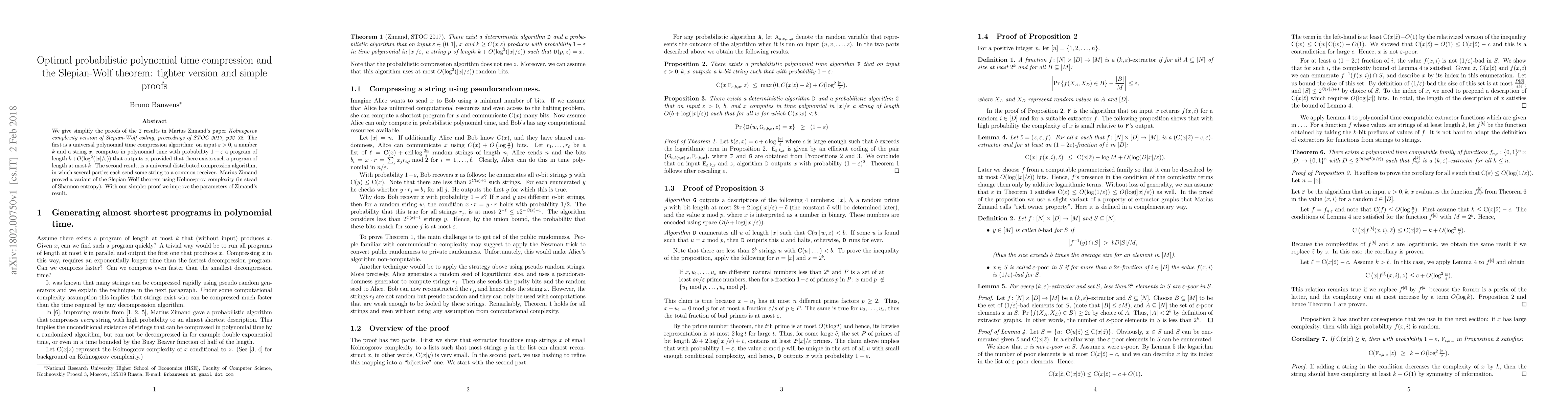 We give simplify the proofs of the 2 results in Marius Zimand's paper "Kolmogorov complexity version of Slepian-Wolf coding, proceedings of STOC 2017, p22--32". The first is a universal polynomial time compression algorithm: on input $\varepsilon > 0$, a number $k$ and a string $x$ it computes in polynomial time with probability $1-\varepsilon$ a program that outputs $x$ and has length $k + O(\log^2 (|x|/\varepsilon))$, provided that there exists such a program of length at most $k$. The second result, is a distributed compression algorithm, in which several parties each send some string to a common receiver. Marius Zimand proved a variant of the Slepian-Wolf theorem using Kolmogorov complexity (in stead of Shannon entropy). With our simpler proof we improve the parameters of Zimand's result.
