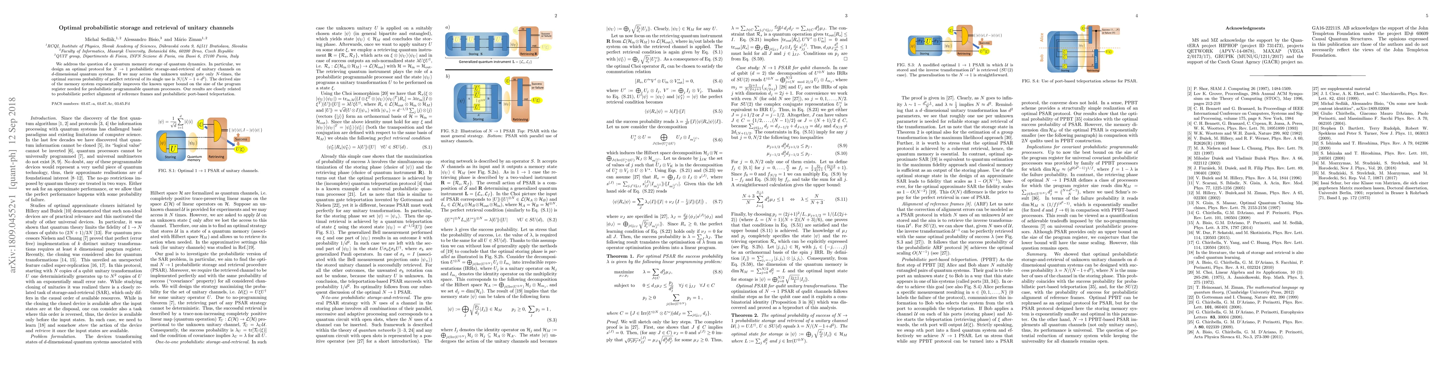 This paper proposes an optimal probabilistic protocol for storing and retrieving unitary channels in quantum memory, achieving a success probability of $N/(N-1+d^2)$ when accessing the unitary gate $N$ times. The derived memory size significantly enhances the known upper bound for quantum processors, linking the results to probabilistic perfect alignment and teleportation.