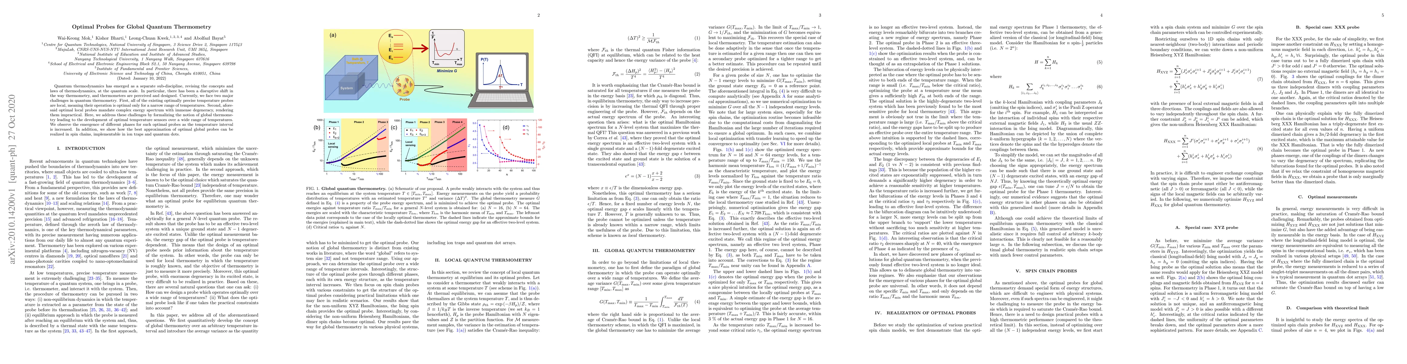 This paper develops optimal global probes for quantum thermometry that operate over a wide range of temperatures, addressing the limitations of existing local probes. It demonstrates the feasibility of implementing these probes in spin chains, ion traps, and quantum dots.