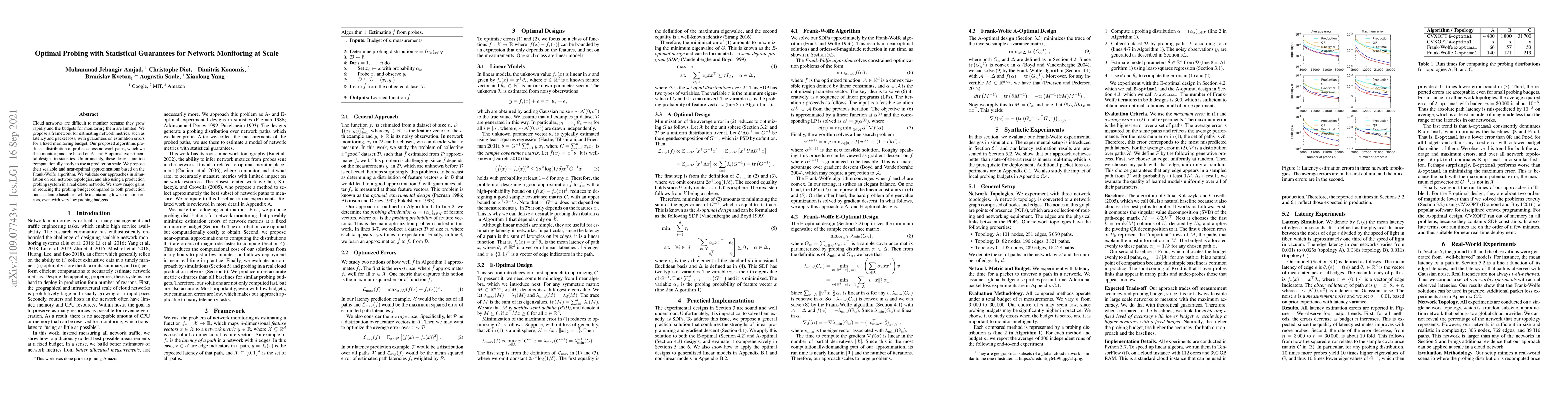 Cloud networks are difficult to monitor because they grow rapidly and the budgets for monitoring them are limited. We propose a framework for estimating network metrics, such as latency and packet loss, with guarantees on estimation errors for a fixed monitoring budget. Our proposed algorithms produce a distribution of probes across network paths, which we then monitor; and are based on A- and E-optimal experimental designs in statistics. Unfortunately, these designs are too computationally costly to use at production scale. We propose their scalable and near-optimal approximations based on the Frank-Wolfe algorithm. We validate our approaches in simulation on real network topologies, and also using a production probing system in a real cloud network. We show major gains in reducing the probing budget compared to both production and academic baselines, while maintaining low estimation errors, even with very low probing budgets.