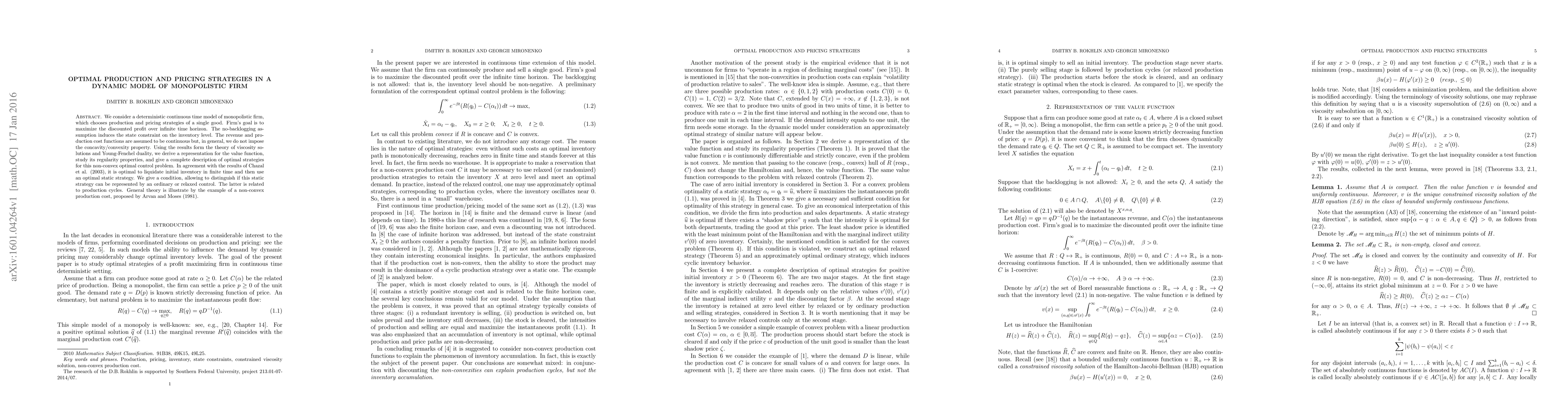 This paper develops a dynamic model for a monopolistic firm to maximize discounted profit over an infinite time horizon, deriving optimal production and pricing strategies using viscosity solutions and Young-Fenchel duality. The firm optimally liquidates initial inventory before adopting a static strategy, with conditions distinguishing between ordinary and relaxed controls linked to production cycles.