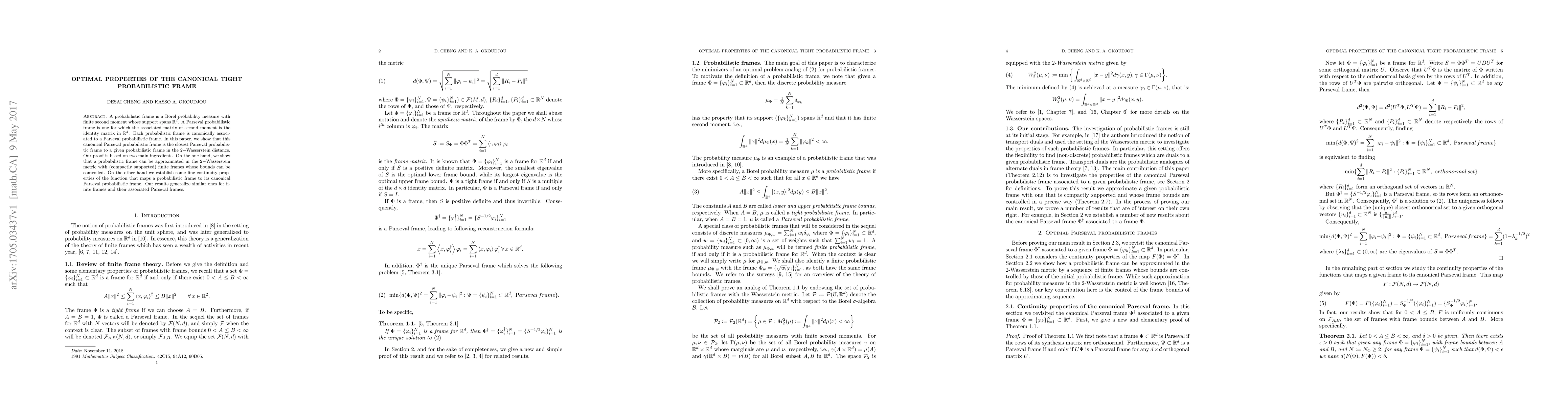 A probabilistic frame is a Borel probability measure with finite second moment whose support spans $\mathbb{R}^d$. A Parseval probabilistic frame is one for which the associated matrix of the second moments is the identity matrix in $\mathbb{R}^d$. Each probabilistic frame is canonically associated to a Parseval probabilistic frame. In this paper, we show that this canonical Parseval probabilistic frame is the closest Parseval probabilistic frame to a given probabilistic frame in the $2-$Wasserstein distance. Our proof is based on two main ingredients. On the one hand, we show that a probabilistic frame can be approximated in the $2-$Wasserstein metric with (compactly supported) finite frames whose bounds can be controlled. On the other hand, we establish some fine continuity properties of the function that maps a probabilistic frame to its canonical Parseval probabilistic frame. Our results generalize similar ones for finite frames and their associated Parseval frames.