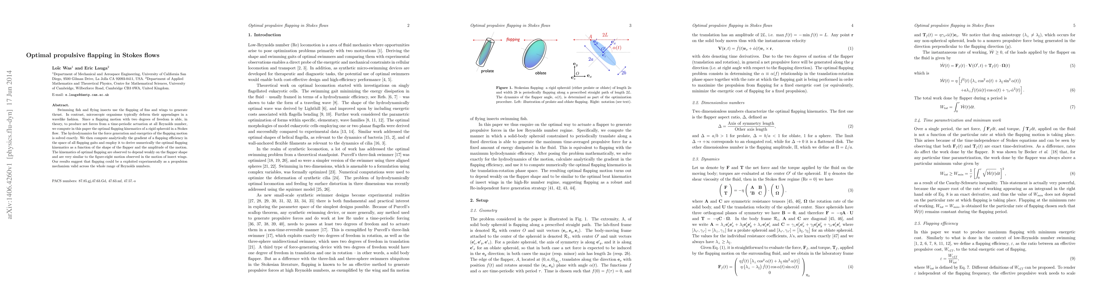 This paper investigates the optimal flapping kinematics for a rigid spheroid in Stokes flow, determining the most efficient motion for generating thrust. The study finds that the optimal flapping motion, resembling a figure-eight, is effective across all Reynolds numbers and is relatively independent of the spheroid's shape.