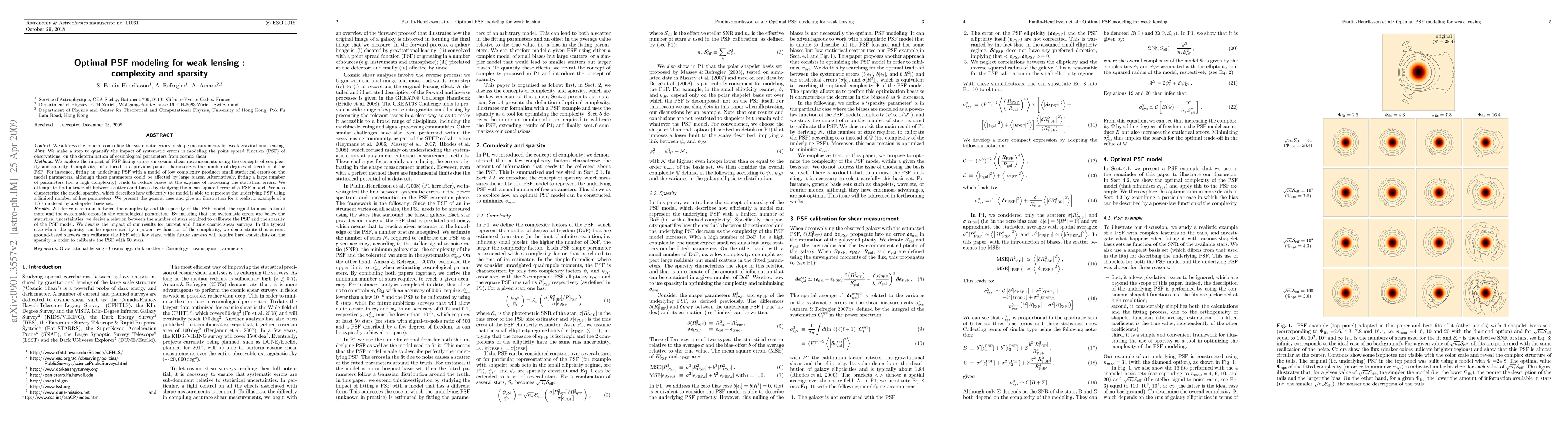 This paper explores the balance between complexity and sparsity in modeling the point spread function (PSF) for weak lensing studies, aiming to minimize both scatters and biases in cosmic shear measurements. It finds that while lower complexity models reduce statistical errors, they may introduce large biases, whereas higher complexity models reduce biases but increase statistical errors. The study optimizes the PSF model by considering its mean squared error and derives a relationship between complexity, sparsity, and the required number of stars for calibration, highlighting the need for stringent sparsity constraints in future surveys.