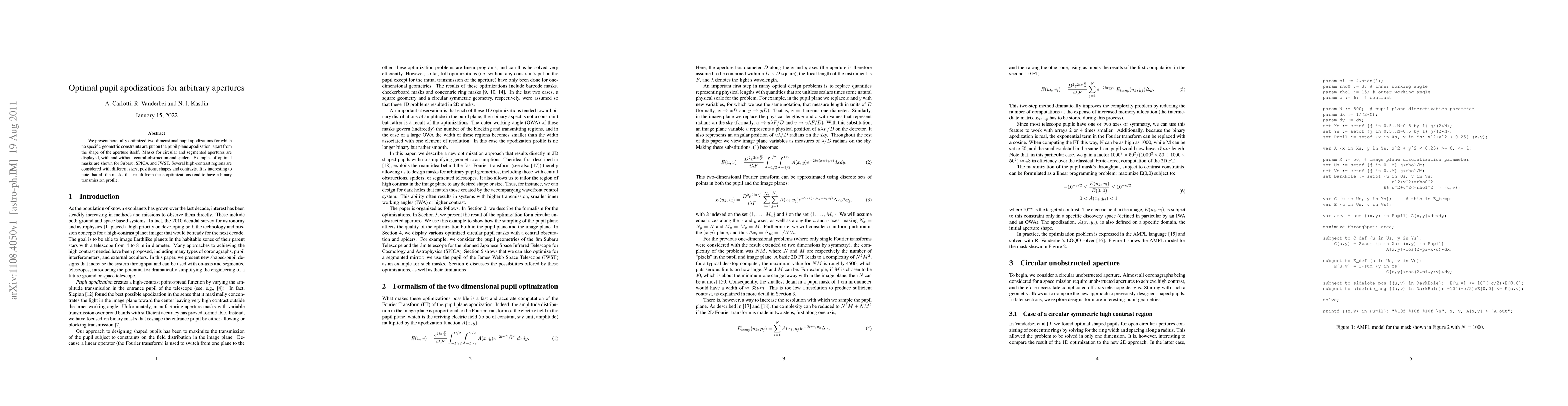 Researchers developed optimized pupil apodizations for various telescopes without specific constraints, resulting in binary transmission profiles that improve high-contrast imaging.