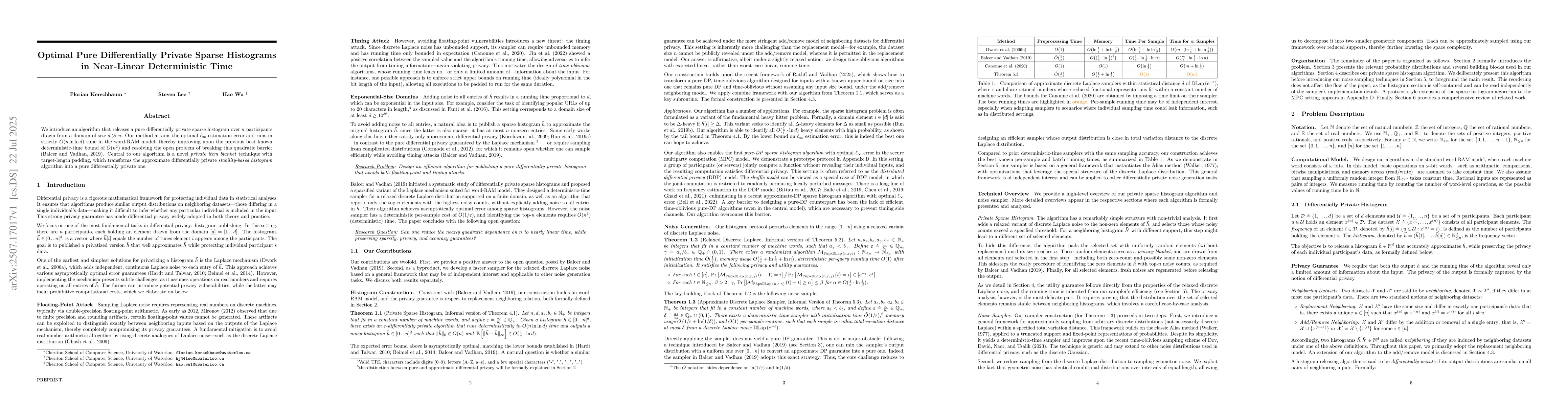 The paper presents an algorithm for releasing private sparse histograms with optimal error and near-linear time complexity. It introduces a novel private item blanket technique, improving upon previous quadratic bounds and resolving an open problem in differential privacy.