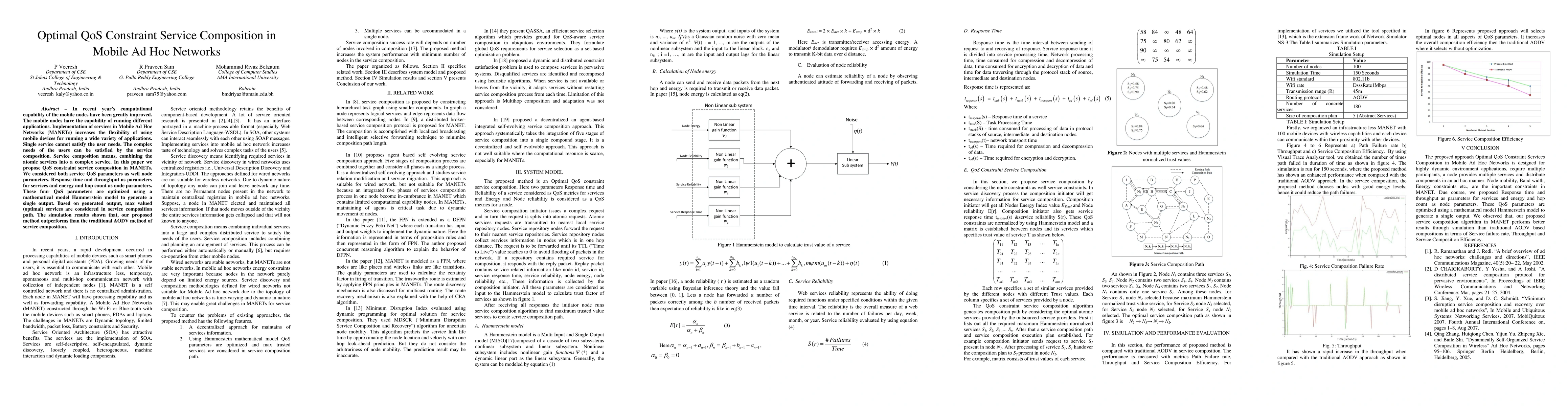 This paper proposes a QoS constraint service composition method in Mobile Ad Hoc Networks (MANETs) that optimizes response time, throughput, energy, and hop count using a Hammerstein model. The method outperforms traditional AODV in service composition.