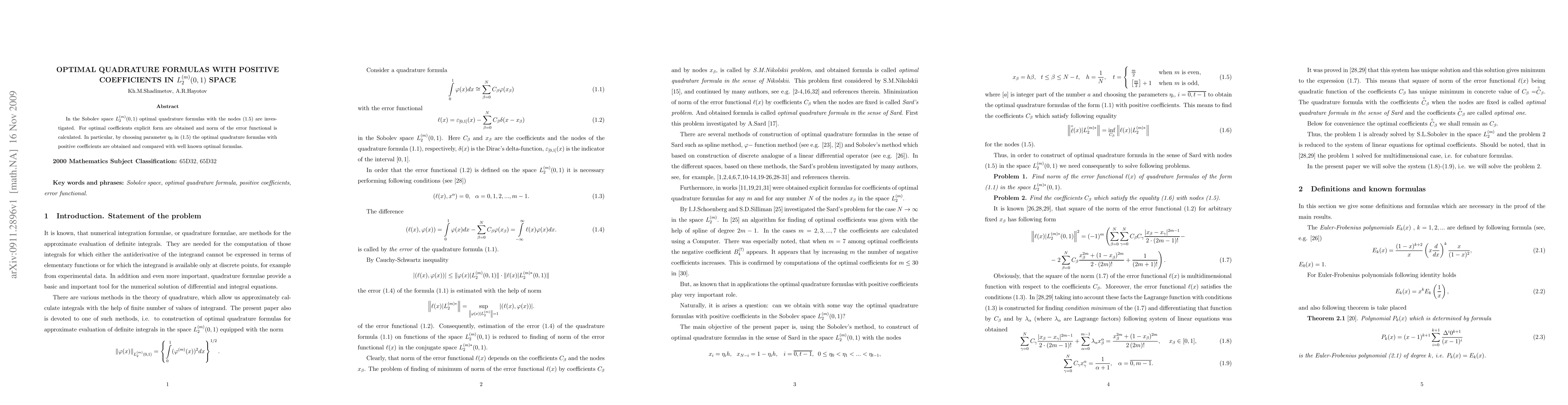 This paper investigates optimal quadrature formulas in the Sobolev space $L_2^{(m)}(0,1)$ with nodes derived from (1.5). It derives explicit forms for optimal coefficients and calculates the error norm, achieving optimal quadrature formulas with positive coefficients by choosing parameter $\eta_0$.