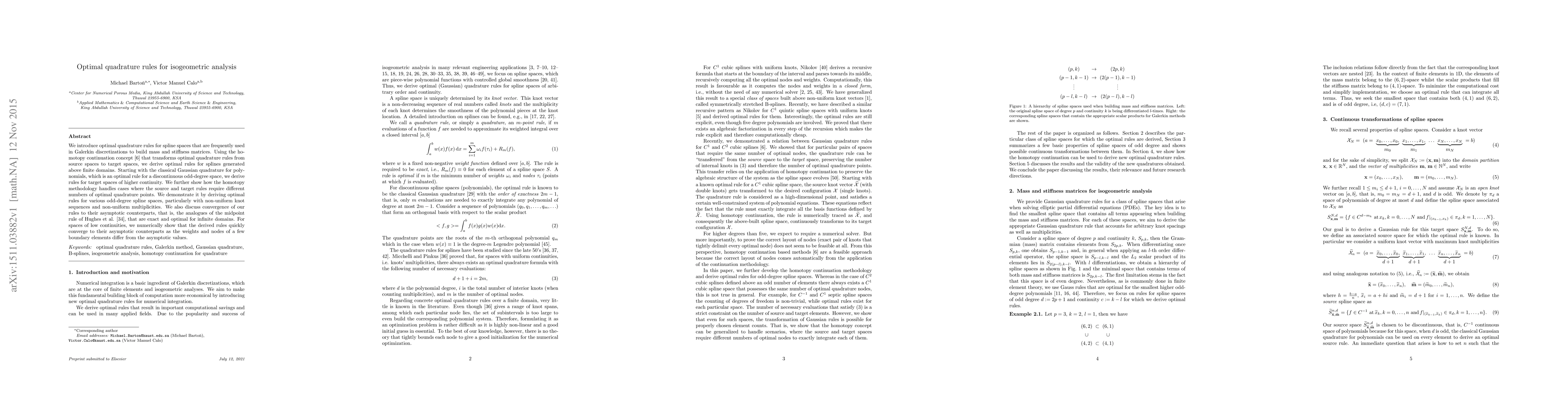 This paper introduces optimal quadrature rules for spline spaces used in isogeometric analysis, derived via homotopy continuation from classical Gaussian quadrature. It demonstrates convergence to asymptotic counterparts for low-continuity spaces and applies the methodology to non-uniform splines.