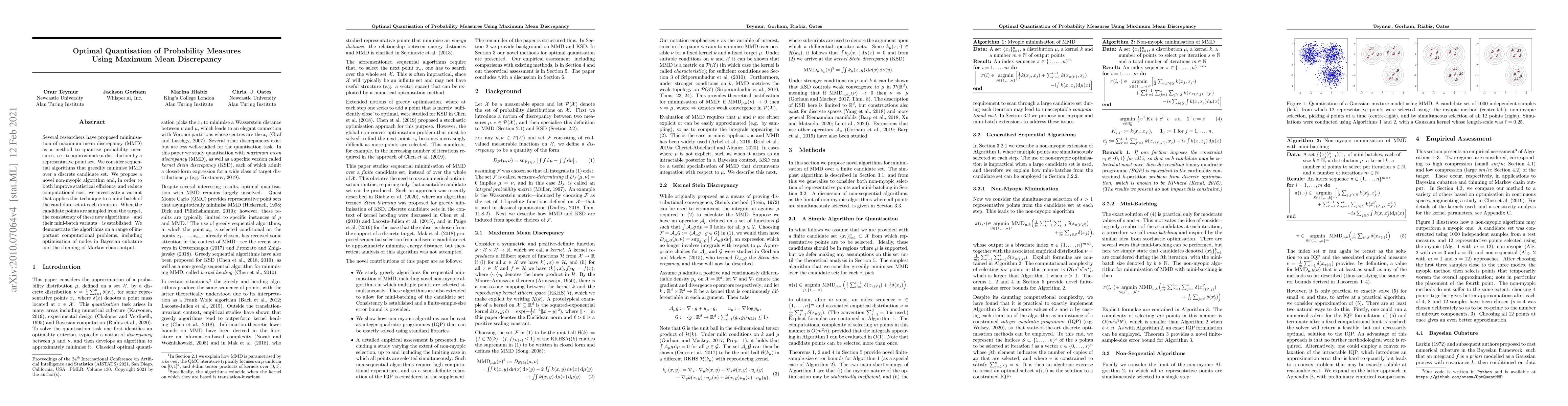 Researchers propose a novel algorithm for quantizing probability measures by minimizing maximum mean discrepancy, demonstrating improved efficiency and reduced computational cost.