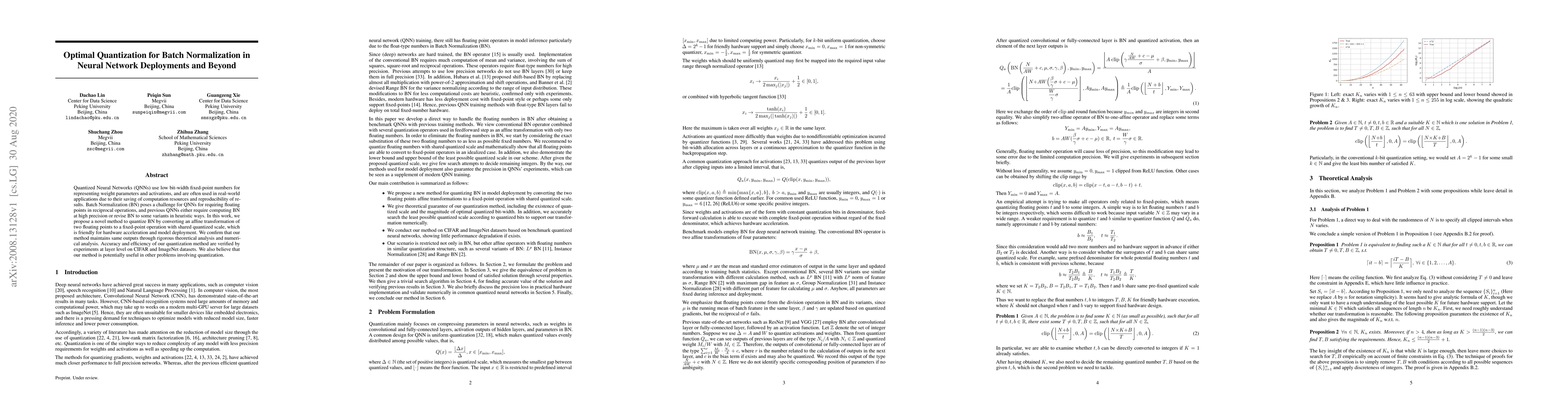 Quantized Neural Networks (QNNs) use low bit-width fixed-point numbers for representing weight parameters and activations, and are often used in real-world applications due to their saving of computation resources and reproducibility of results. Batch Normalization (BN) poses a challenge for QNNs for requiring floating points in reciprocal operations, and previous QNNs either require computing BN at high precision or revise BN to some variants in heuristic ways. In this work, we propose a novel method to quantize BN by converting an affine transformation of two floating points to a fixed-point operation with shared quantized scale, which is friendly for hardware acceleration and model deployment. We confirm that our method maintains same outputs through rigorous theoretical analysis and numerical analysis. Accuracy and efficiency of our quantization method are verified by experiments at layer level on CIFAR and ImageNet datasets. We also believe that our method is potentially useful in other problems involving quantization.