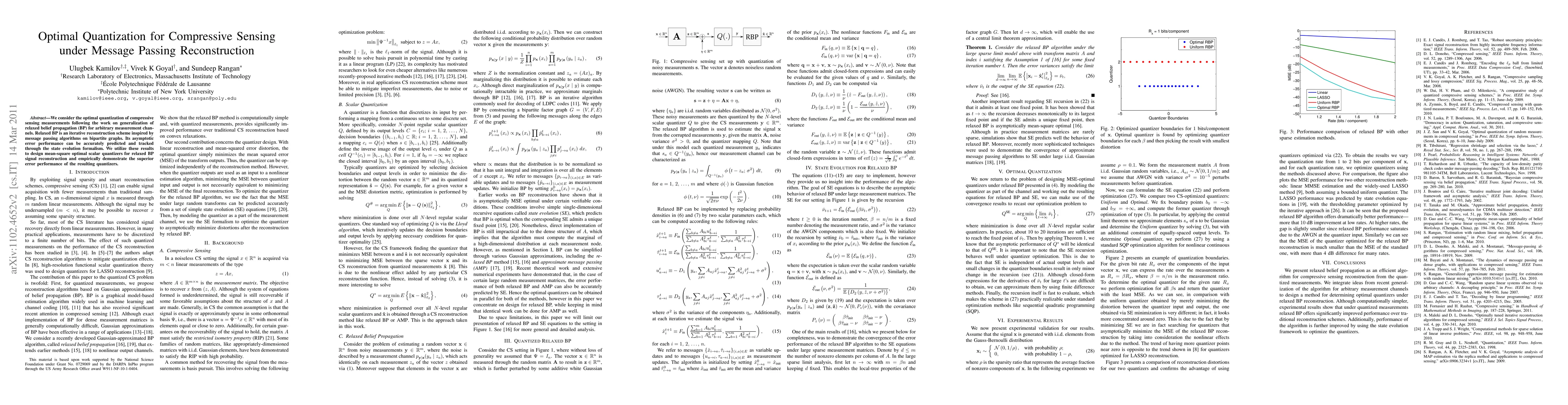 This paper designs mean-square optimal scalar quantizers for compressive sensing reconstruction using relaxed belief propagation, leveraging state evolution formalism to predict and track asymptotic error performance, and demonstrates improved error results empirically.