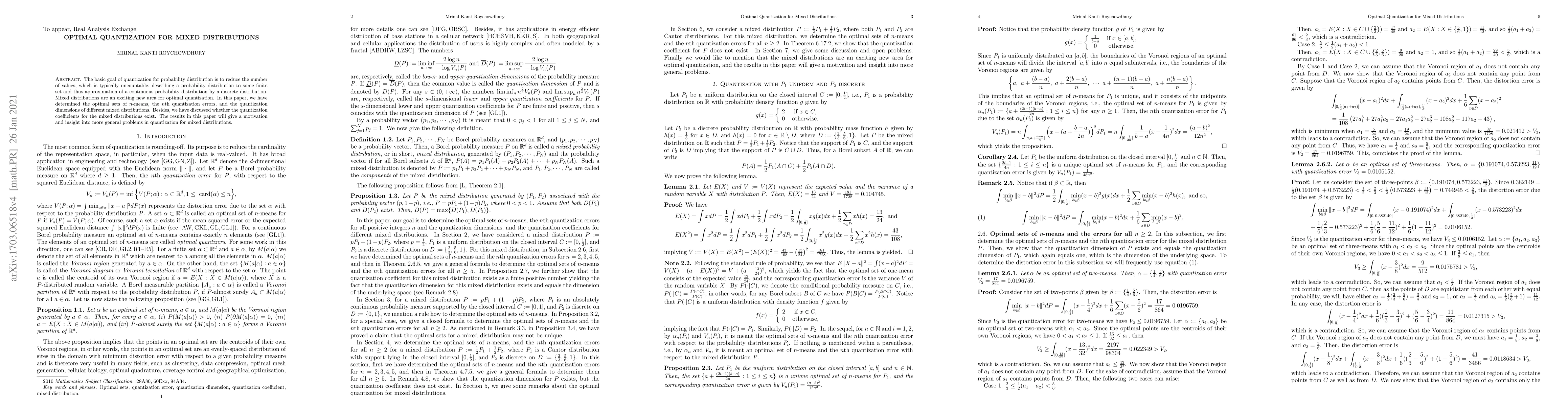 The paper presents a detailed mathematical framework and proofs for determining optimal quantization sets for mixed distributions, including theorems and lemmas on n-means and quantization errors.