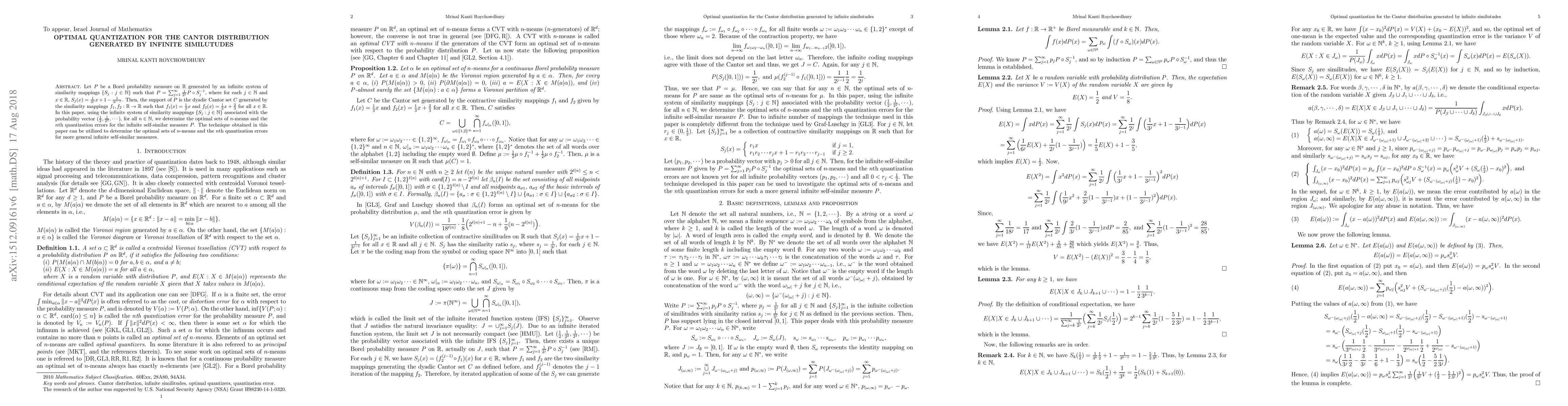 Researchers found optimal sets of n-means for the Cantor distribution generated by infinite similarities, minimizing quantization errors. This breakthrough can apply to more general infinite self-similar measures.