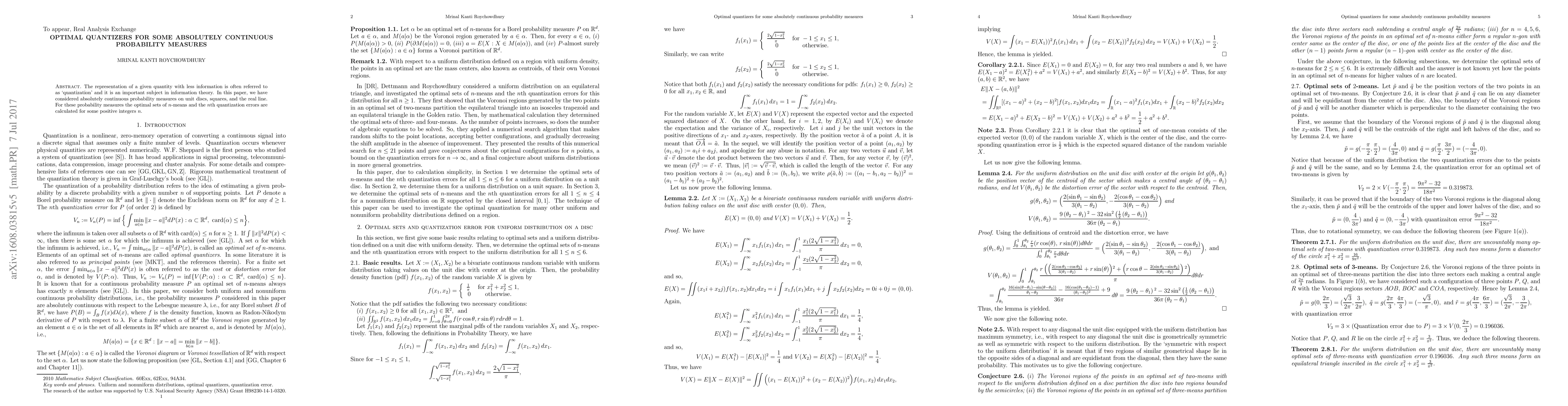 This paper calculates optimal sets of n-means and nth quantization errors for absolutely continuous probability measures on unit discs, squares, and the real line, contributing to the field of information theory by providing precise quantization representations.