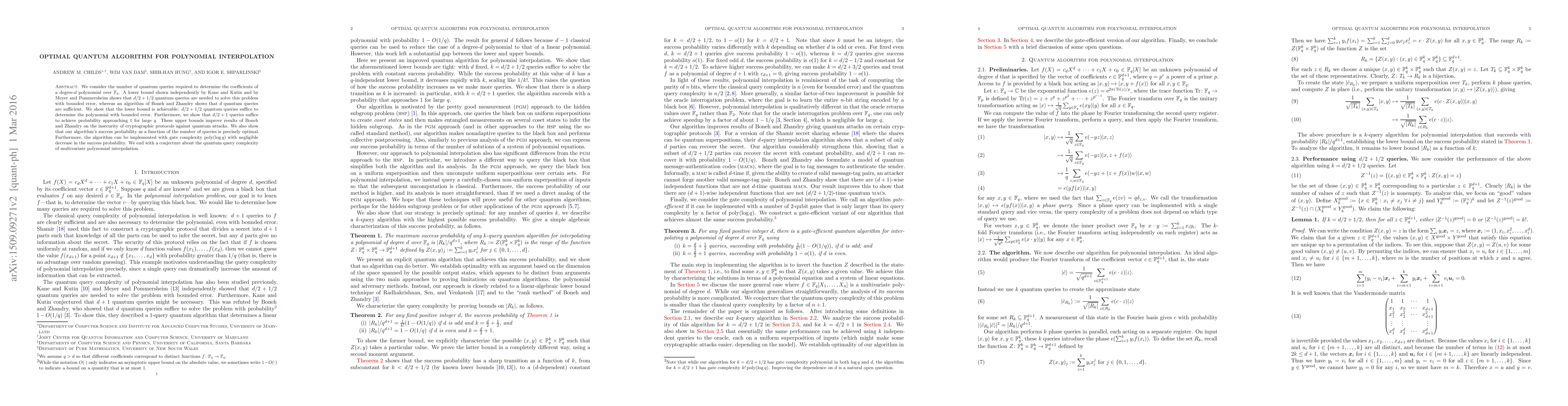 We consider the number of quantum queries required to determine the coefficients of a degree-d polynomial over GF(q). A lower bound shown independently by Kane and Kutin and by Meyer and Pommersheim shows that d/2+1/2 quantum queries are needed to solve this problem with bounded error, whereas an algorithm of Boneh and Zhandry shows that d quantum queries are sufficient. We show that the lower bound is achievable: d/2+1/2 quantum queries suffice to determine the polynomial with bounded error. Furthermore, we show that d/2+1 queries suffice to achieve probability approaching 1 for large q. These upper bounds improve results of Boneh and Zhandry on the insecurity of cryptographic protocols against quantum attacks. We also show that our algorithm's success probability as a function of the number of queries is precisely optimal. Furthermore, the algorithm can be implemented with gate complexity poly(log q) with negligible decrease in the success probability. We end with a conjecture about the quantum query complexity of multivariate polynomial interpolation.