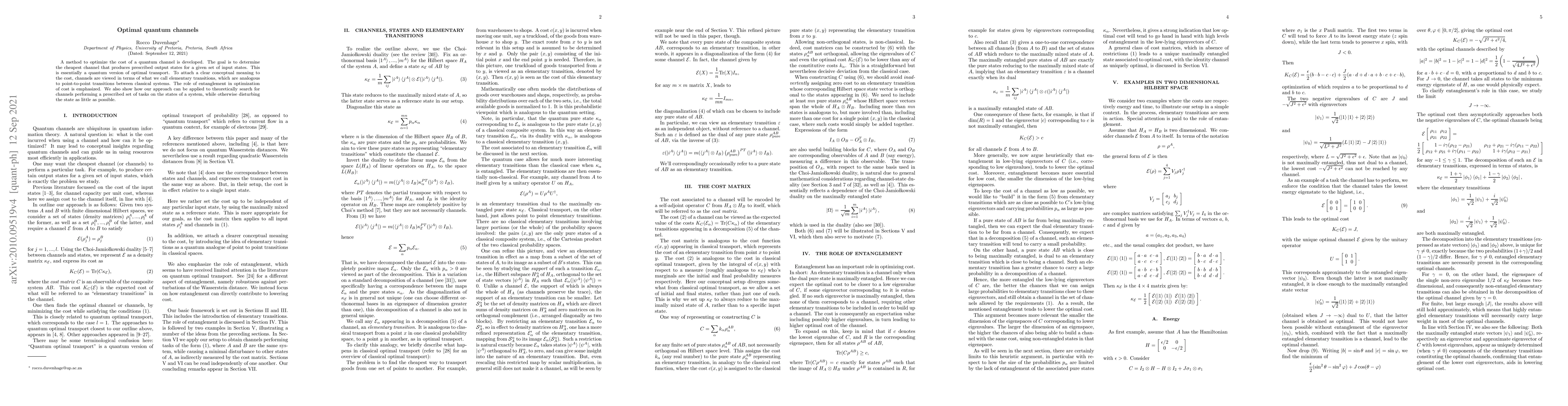 A method to optimize the cost of a quantum channel is developed. The goal is to determine the cheapest channel that produces prescribed output states for a given set of input states. This is essentially a quantum version of optimal transport. To attach a clear conceptual meaning to the cost, channels are viewed in terms of what we call elementary transitions, which are analogous to point-to-point transitions between classical systems. The role of entanglement in optimization of cost is emphasized. We also show how our approach can be applied to theoretically search for channels performing a prescribed set of tasks on the states of a system, while otherwise disturbing the state as little as possible.