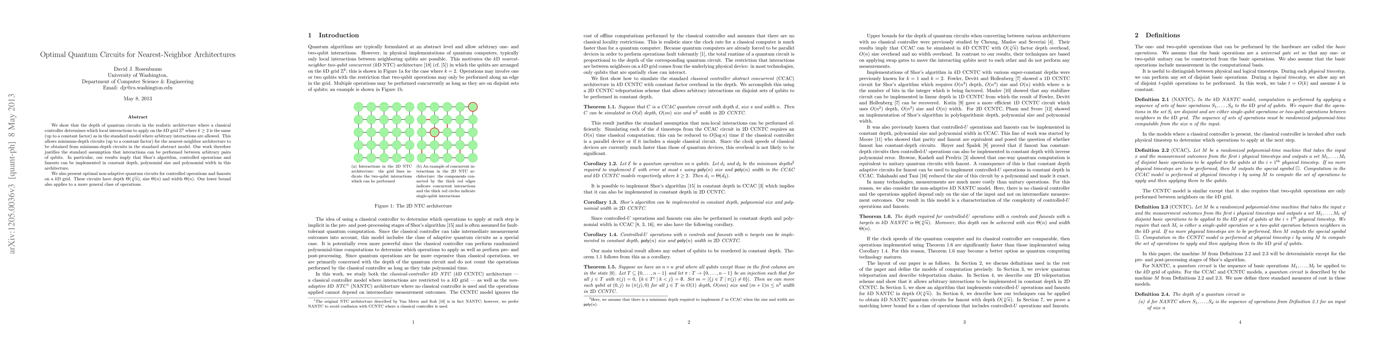 This paper demonstrates that quantum circuits in nearest-neighbor architectures have similar depth to those in standard models, allowing for efficient translation of minimum-depth circuits. It presents optimal non-adaptive circuits for controlled operations and fanouts on kD grids with depth Theta(n^(1/k)), size Theta(n), and width Theta(n).
