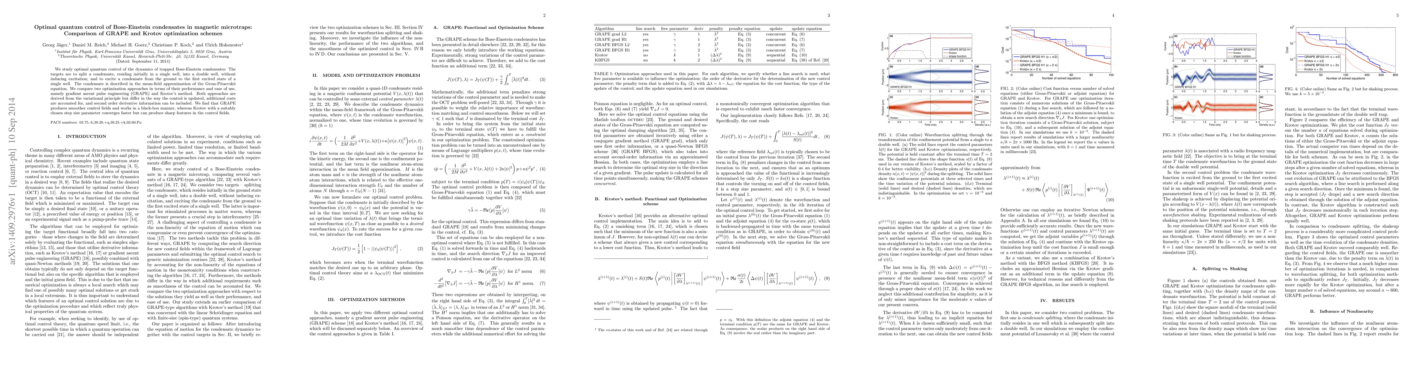 This paper compares GRAPE and Krotov optimization methods for controlling Bose-Einstein condensates in magnetic microtraps, focusing on splitting a condensate into a double well and exciting it to the first excited state. GRAPE yields smoother control fields, while Krotov converges faster but may produce sharper control features.