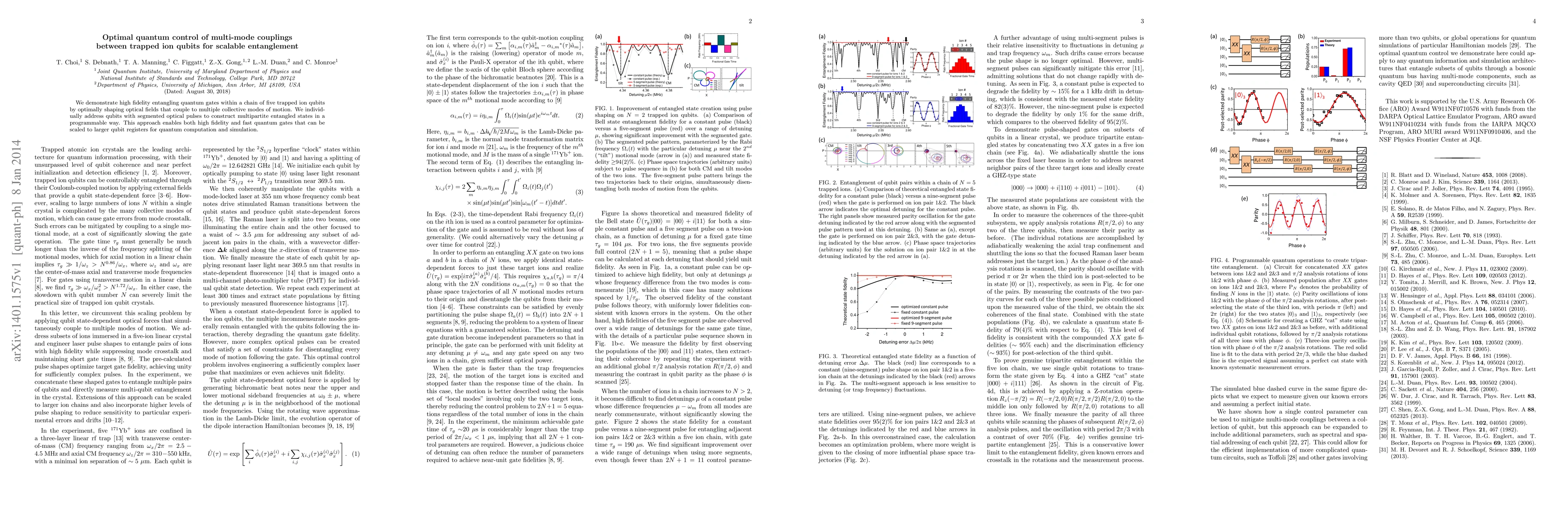 This paper presents a method for high fidelity entangling quantum gates in a chain of five trapped ion qubits using optimally shaped optical fields to couple multiple collective modes. The approach allows for scalable entanglement and fast quantum gates, facilitating quantum computation and simulation.