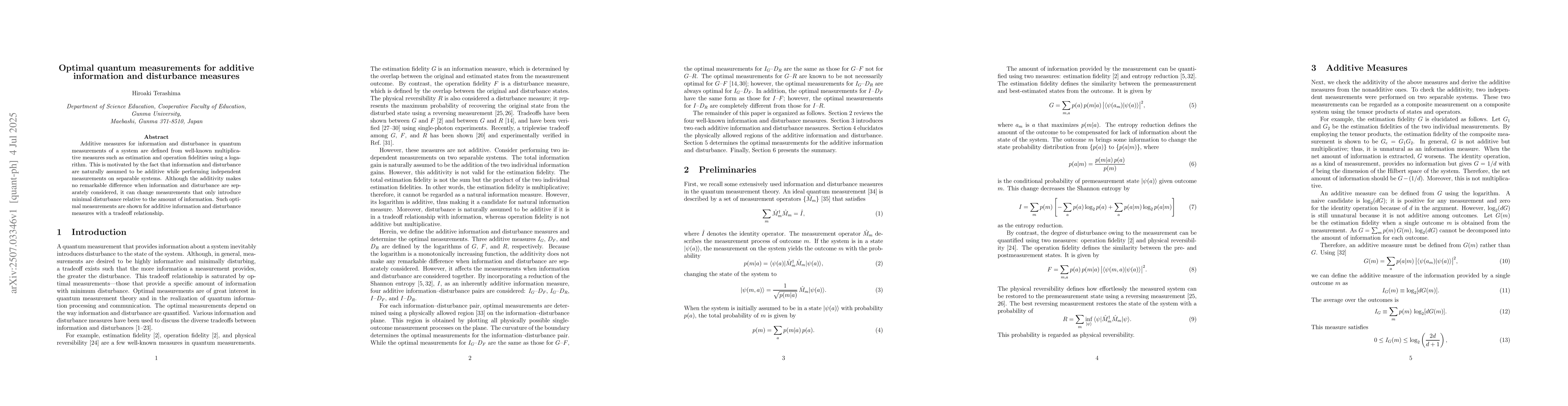 Additive measures for information and disturbance in quantum measurements of a system are defined from well-known multiplicative measures such as estimation and operation fidelities using a logarithm. This is motivated by the fact that information and disturbance are naturally assumed to be additive while performing independent measurements on separable systems. Although the additivity makes no remarkable difference when information and disturbance are separately considered, it can change measurements that only introduce minimal disturbance relative to the amount of information. Such optimal measurements are shown for additive information and disturbance measures with a tradeoff relationship.