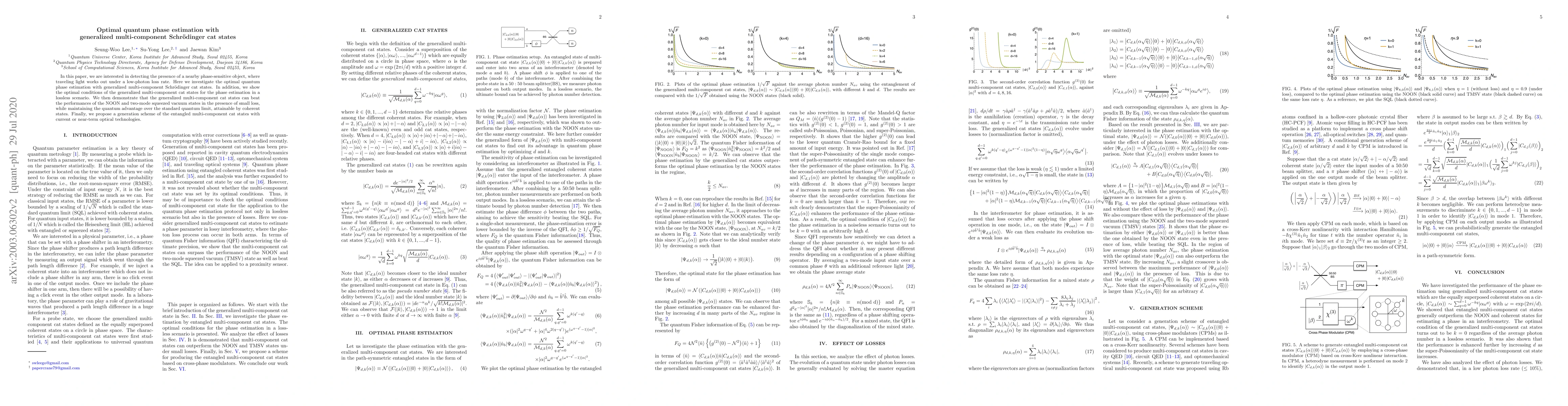This paper explores optimal quantum phase estimation using generalized multi-component Schrödinger cat states, demonstrating their superior performance over NOON and two-mode squeezed vacuum states in low-photon loss scenarios. It also proposes a generation scheme for these states using current optical technologies.
