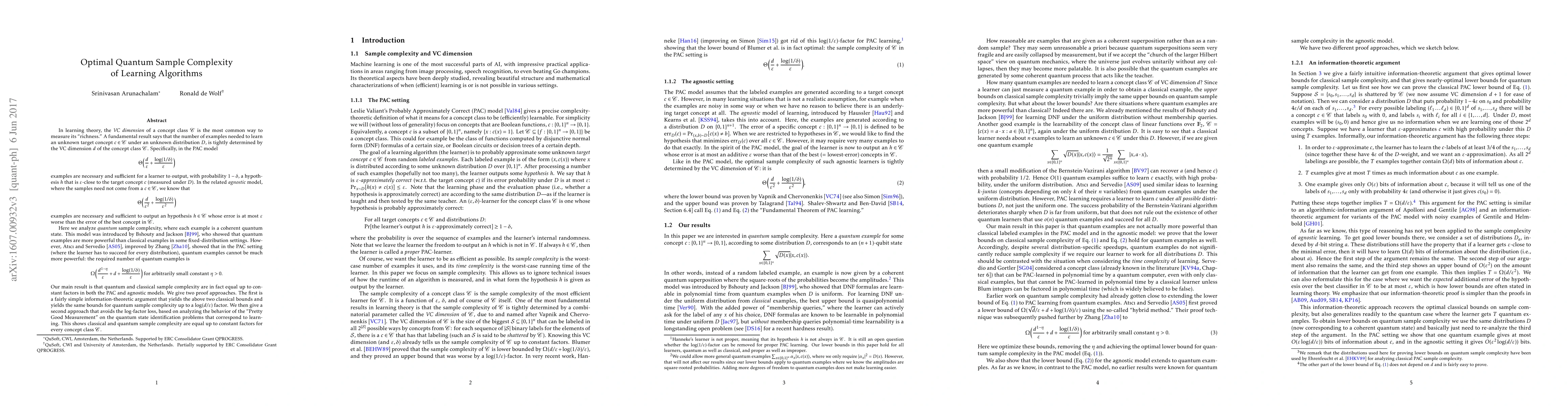 $ \newcommand{\eps}{\varepsilon} $In learning theory, the VC dimension of a concept class $C$ is the most common way to measure its "richness." In the PAC model $$ \Theta\Big(\frac{d}{\eps} + \frac{\log(1/\delta)}{\eps}\Big) $$ examples are necessary and sufficient for a learner to output, with probability $1-\delta$, a hypothesis $h$ that is $\eps$-close to the target concept $c$. In the related agnostic model, where the samples need not come from a $c\in C$, we know that $$ \Theta\Big(\frac{d}{\eps^2} + \frac{\log(1/\delta)}{\eps^2}\Big) $$ examples are necessary and sufficient to output an hypothesis $h\in C$ whose error is at most $\eps$ worse than the best concept in $C$. Here we analyze quantum sample complexity, where each example is a coherent quantum state. This model was introduced by Bshouty and Jackson, who showed that quantum examples are more powerful than classical examples in some fixed-distribution settings. However, Atici and Servedio, improved by Zhang, showed that in the PAC setting, quantum examples cannot be much more powerful: the required number of quantum examples is $$ \Omega\Big(\frac{d^{1-\eta}}{\eps} + d + \frac{\log(1/\delta)}{\eps}\Big)\mbox{ for all }\eta> 0. $$ Our main result is that quantum and classical sample complexity are in fact equal up to constant factors in both the PAC and agnostic models. We give two approaches. The first is a fairly simple information-theoretic argument that yields the above two classical bounds and yields the same bounds for quantum sample complexity up to a $\log(d/\eps)$ factor. We then give a second approach that avoids the log-factor loss, based on analyzing the behavior of the "Pretty Good Measurement" on the quantum state identification problems that correspond to learning. This shows classical and quantum sample complexity are equal up to constant factors.