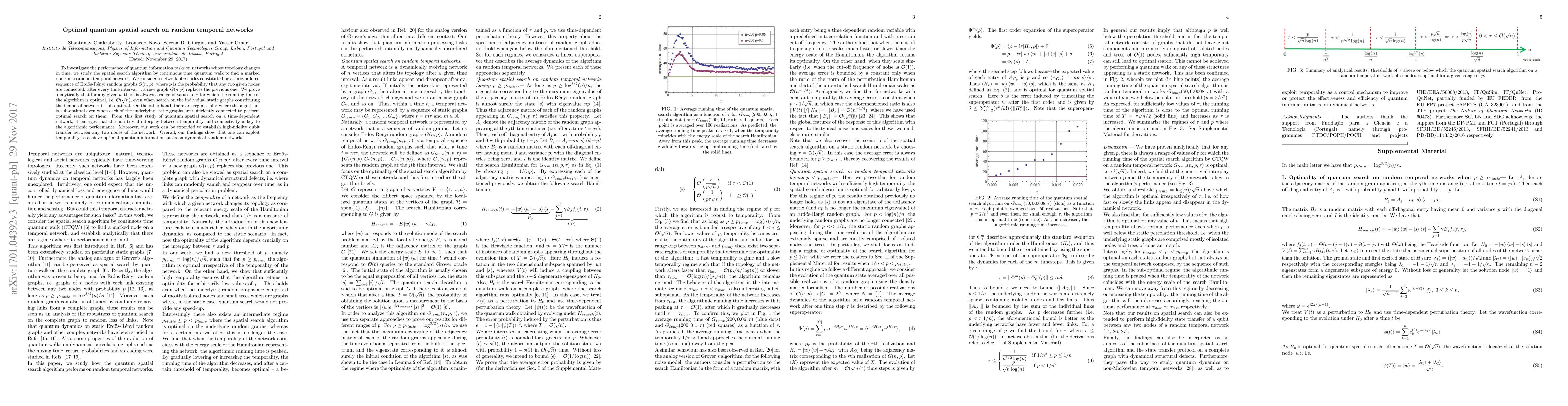 To investigate the performance of quantum information tasks on networks whose topology changes in time, we study the spatial search algorithm by continuous time quantum walk to find a marked node on a random temporal network. We consider a network of $n$ nodes constituted by a time-ordered sequence of Erd\"os-R\'enyi random graphs $G(n,p)$, where $p$ is the probability that any two given nodes are connected: after every time interval $\tau$, a new graph $G(n,p)$ replaces the previous one. We prove analytically that for any given $p$, there is always a range of values of $\tau$ for which the running time of the algorithm is optimal, i.e.\ $\mathcal{O}(\sqrt{n})$, even when search on the individual static graphs constituting the temporal network is sub-optimal. On the other hand, there are regimes of $\tau$ where the algorithm is sub-optimal even when each of the underlying static graphs are sufficiently connected to perform optimal search on them. From this first study of quantum spatial search on a time-dependent network, it emerges that the non-trivial interplay between temporality and connectivity is key to the algorithmic performance. Moreover, our work can be extended to establish high-fidelity qubit transfer between any two nodes of the network. Overall, our findings show that one can exploit temporality to achieve optimal quantum information tasks on dynamical random networks.