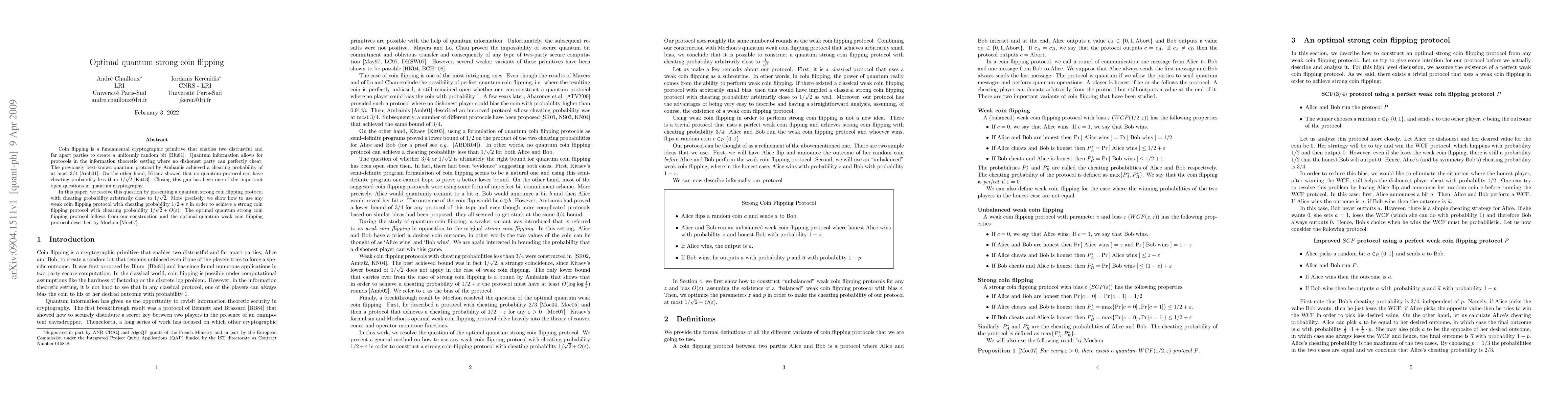 This paper presents a quantum protocol for strong coin flipping with a cheating probability arbitrarily close to $1/\sqrt{2}$, resolving the gap between the best-known quantum protocol and the theoretical lower bound. The authors achieve this by leveraging any weak coin flipping protocol with a small cheating probability to construct a strong one.