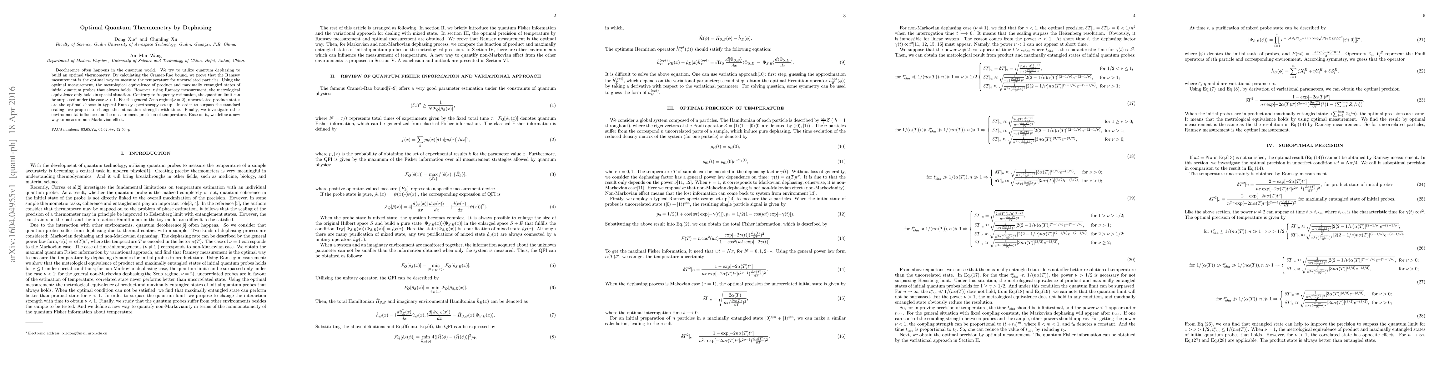 This paper explores optimal quantum thermometry using quantum dephasing, proving that Ramsey measurements are optimal for temperature measurement in uncorrelated particles. It discusses how metrological equivalence varies with different states and proposes changing interaction strength over time to surpass standard scaling limits.