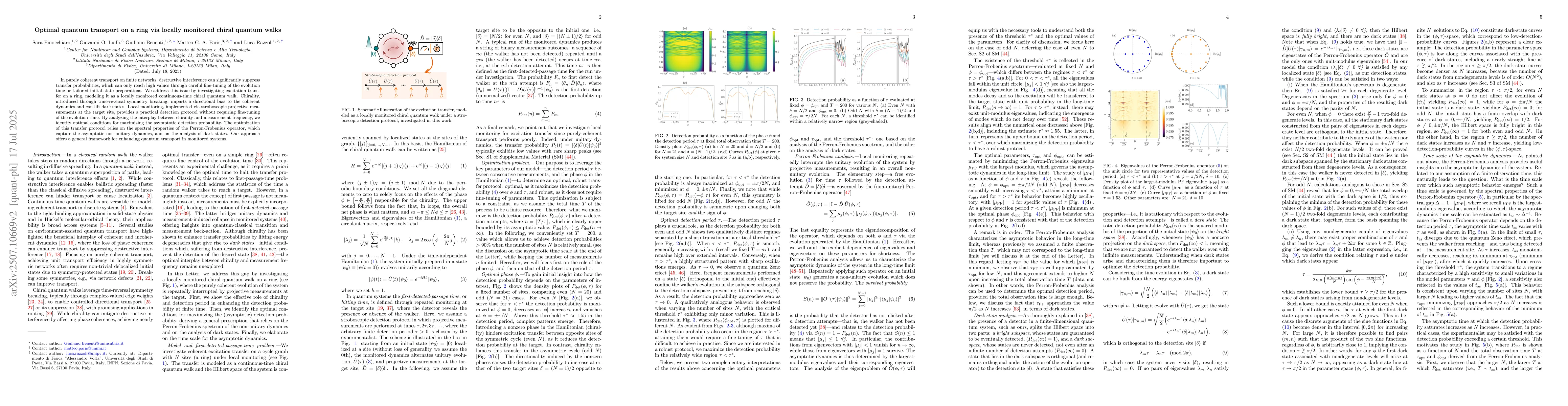 In purely coherent transport on finite networks, destructive interference can significantly suppress transfer probabilities, which can only reach high values through careful fine-tuning of the evolution time or tailored initial-state preparations. We address this issue by investigating excitation transfer on a ring, modeling it as a locally monitored continuous-time chiral quantum walk. Chirality, introduced through time-reversal symmetry breaking, imparts a directional bias to the coherent dynamics and can lift dark states. Local monitoring, implemented via stroboscopic projective measurements at the target site, provides a practical detection protocol without requiring fine-tuning of the evolution time. By analyzing the interplay between chirality and measurement frequency, we identify optimal conditions for maximizing the asymptotic detection probability. The optimization of this transfer protocol relies on the spectral properties of the Perron-Frobenius operator, which capture the asymptotic non-unitary dynamics, and on the analysis of dark states. Our approach offers a general framework for enhancing quantum transport in monitored systems.
