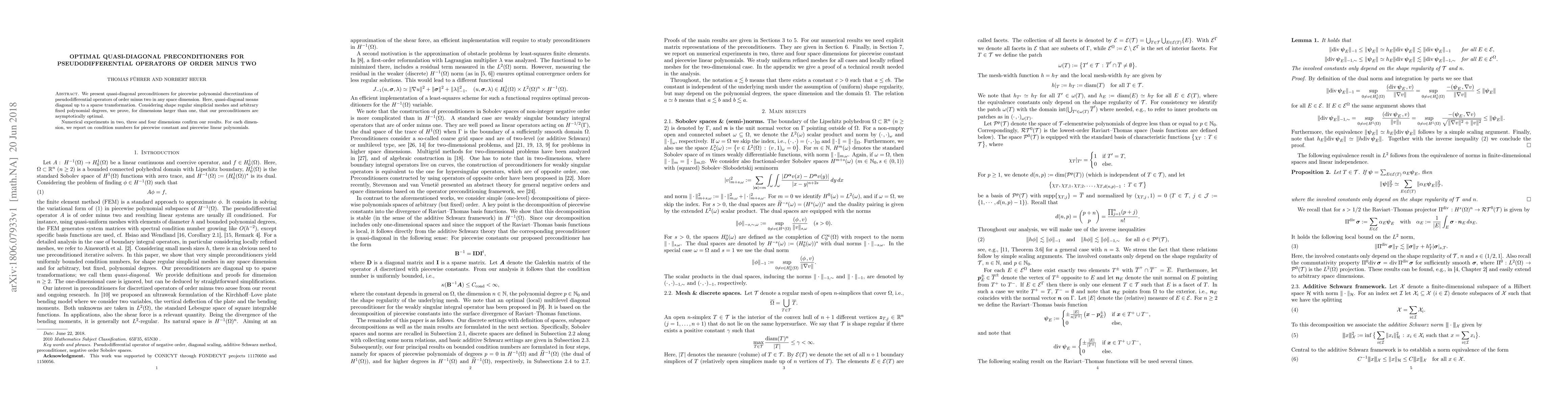 This paper introduces quasi-diagonal preconditioners for discretizing pseudodifferential operators of order minus two, proving their asymptotic optimality in higher dimensions. Numerical experiments across two to four dimensions validate the effectiveness of these preconditioners.