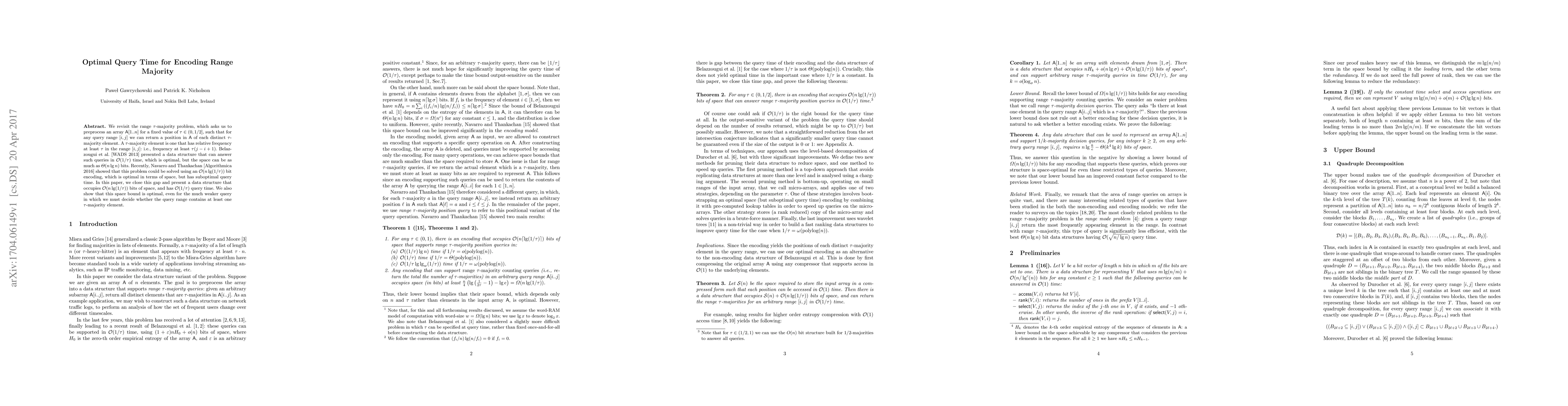This paper presents a data structure that optimally preprocesses an array to answer range $\tau$-majority queries in $O(1/\tau)$ time with $O(n \lg (1/\tau))$ bits of space. It closes the gap between space-efficient and time-efficient solutions for this problem.