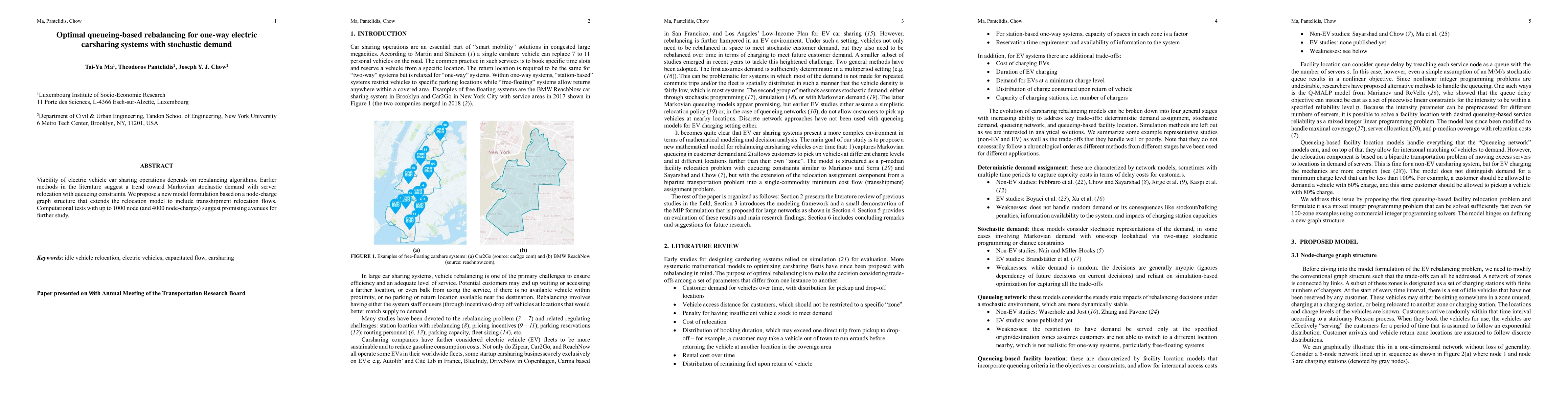 This paper proposes a new model for optimizing rebalancing in one-way electric carsharing systems using a node-charge graph structure that includes transshipment flows, addressing stochastic demand and queueing constraints. Initial computational tests show promising results for scalability and efficiency.