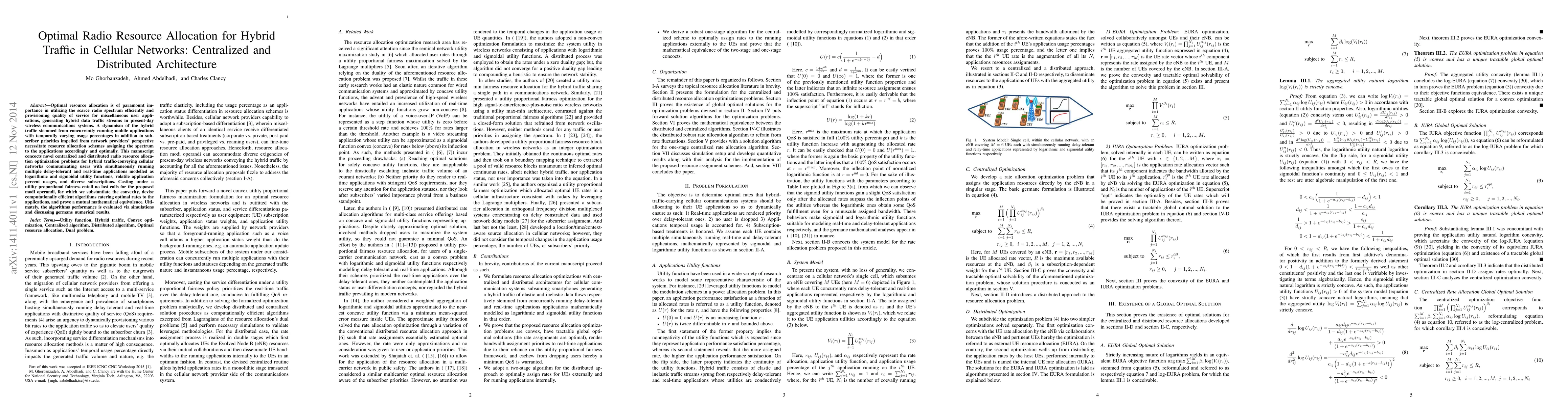 This paper proposes novel centralized and distributed algorithms for optimal radio resource allocation in cellular networks handling hybrid traffic from diverse applications. The algorithms ensure efficient spectrum utilization and quality of service, substantiated by proving convexity and computational efficiency, with performance evaluated via simulations.